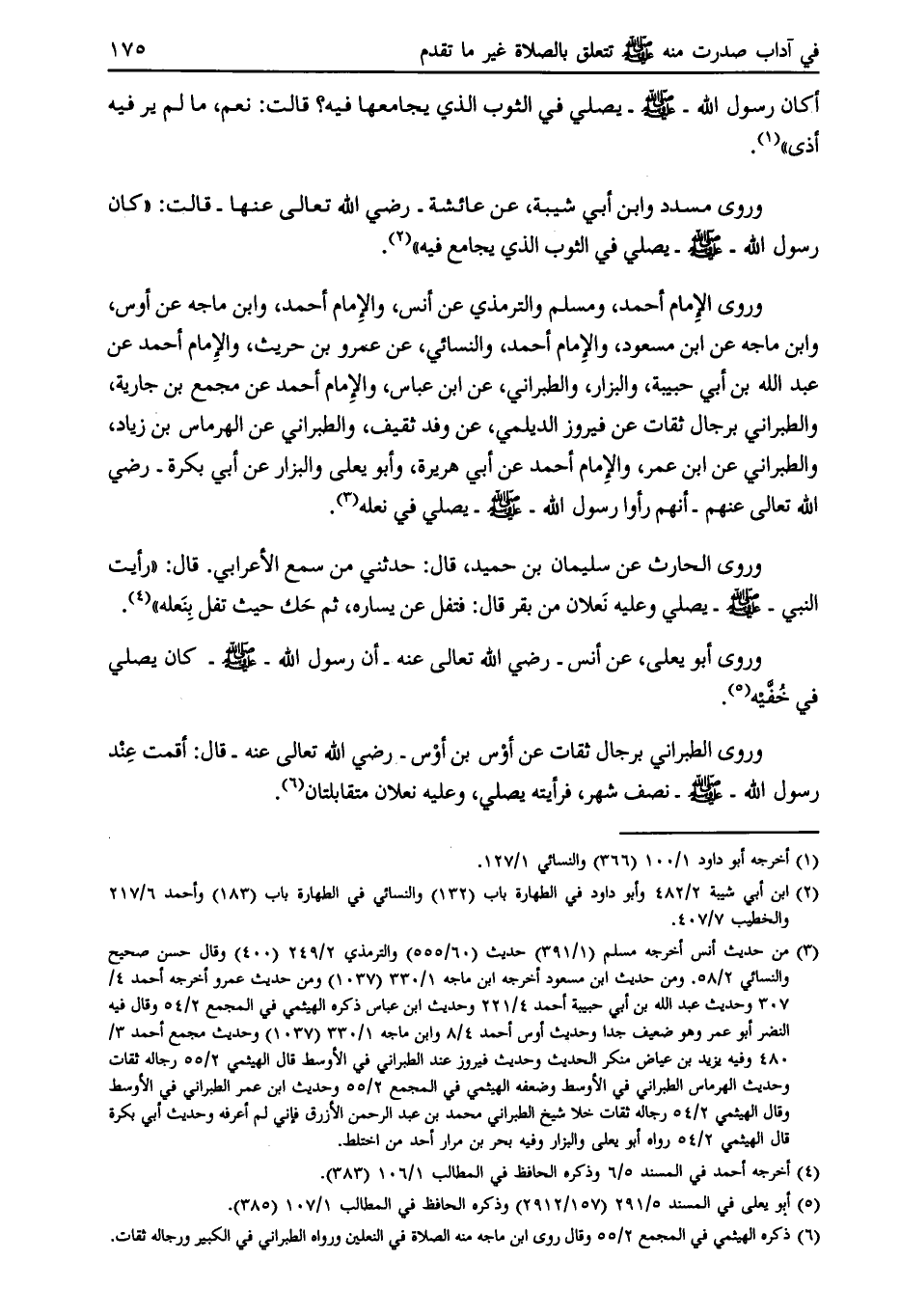وروى الإمام أحمد، ومسلم والترمذي عن أنس، والإمام أحمد، وابن ماجه عن أوس، وابن ماجة عن ابن مسعود، والإمام أحمد، والنسائي، عن عمرو بن حريث، والإمام أحمد عن عبد الله بن أبي حبيبة، والبزار، والطبراني، عن ابن عباس، والإمام أحمد عن مجمع بن جارية، والطبراني برجال ثقات عن فيروز الديلمي، عن وفد ثقيف، والطبراني عن الهرماس بن زياد، والطبراني عن ابن عمر، والإمام أحمد عن أبي هريرة، وأبو يعلى والبزار عن أبي بكرة- رضي الله تعالى عنهم- أنهم رأوا رسول الله- صلى الله عليه وسلم- يصلي في نعله [ (3) ] .