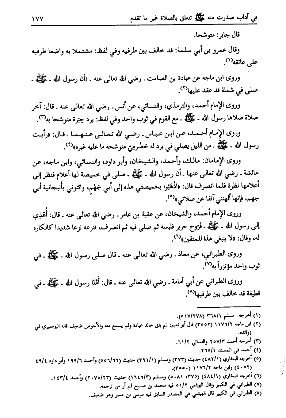 وروى الإمام أحمد، عن ابن عباس- رضي الله تعالى عنهما- قال: «رأيت رسول الله- صلى الله عليه وسلّم- من الليل يصلي في برد له حضرميّ متوشحة ما عليه غيره» [ (4) ] .
