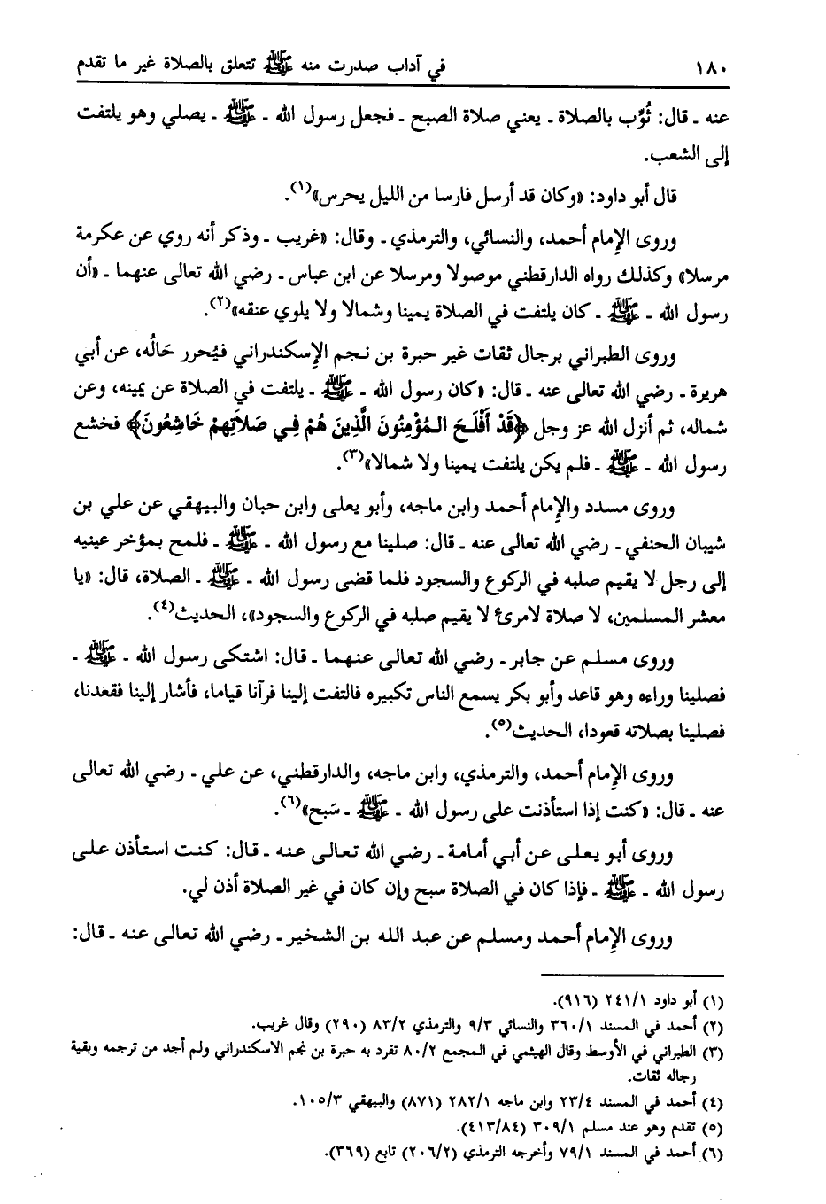 وروى الطبراني برجال ثقات غير حبرة بن نجم الإسكندراني فيحرر حاله، عن أبي هريرة- رضي الله تعالى عنه- قال: «كان رسول الله- صلى الله عليه وسلم- يلتفت في الصلاة عن يمينه، وعن شماله، ثم أنزل الله عزّ وجل قَدْ أَفْلَحَ الْمُؤْمِنُونَ الَّذِينَ هُمْ فِي صَلاتِهِمْ خاشِعُونَ فخشع رسول الله- صلى الله عليه وسلم- فلم يكن يلتفت يمينا ولا شمالا» [ (3) ] .