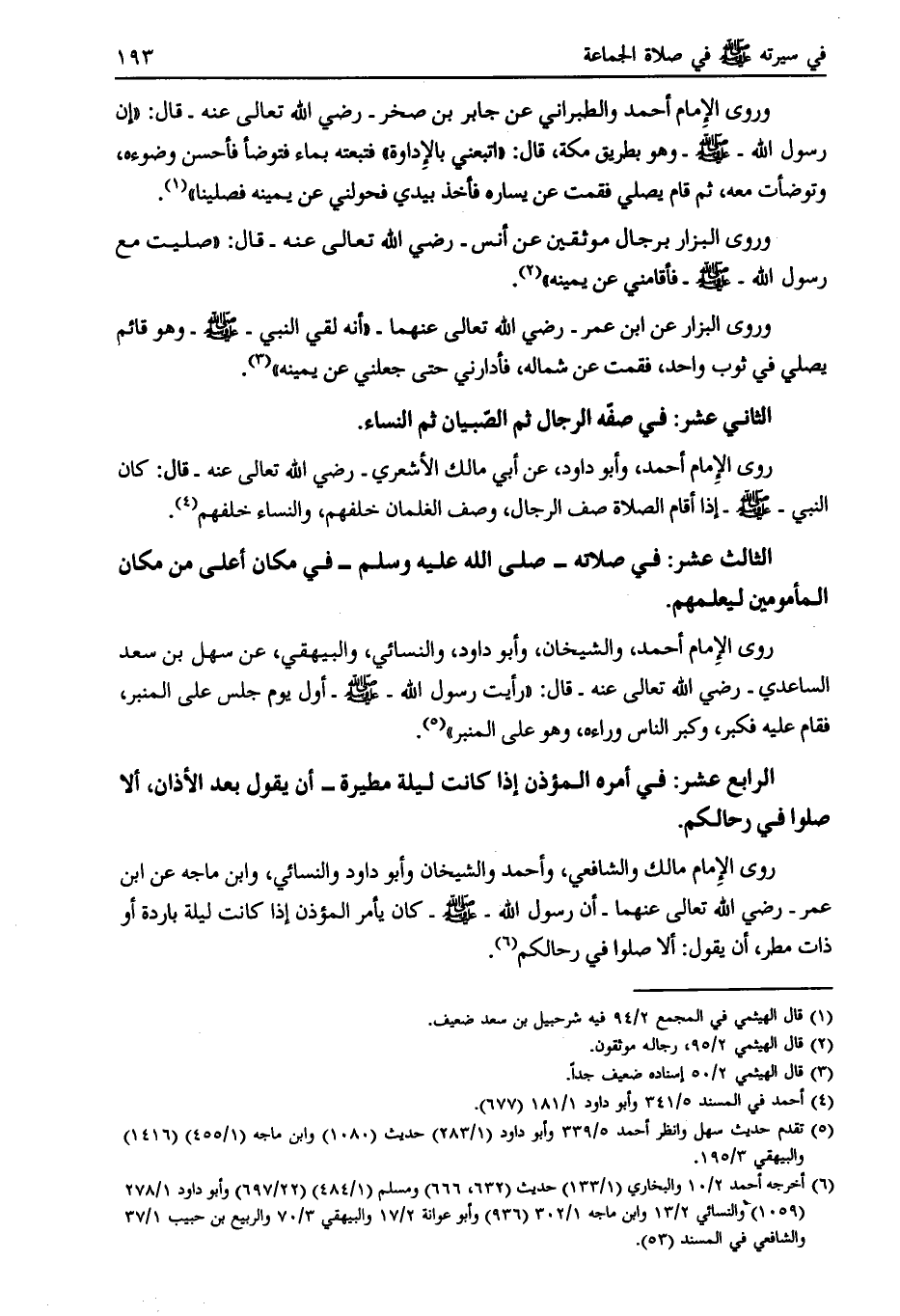 روى الإمام مالك والشافعي، وأحمد والشيخان وأبو داود والنسائي، وابن ماجة عن ابن عمر- رضي الله تعالى عنهما- أن رسول الله- صلى الله عليه وسلم- كان يأمر المؤذن إذا كانت ليلة باردة أو ذات مطر، أن يقول: ألا صلوا في رحالكم [ (6) ] .