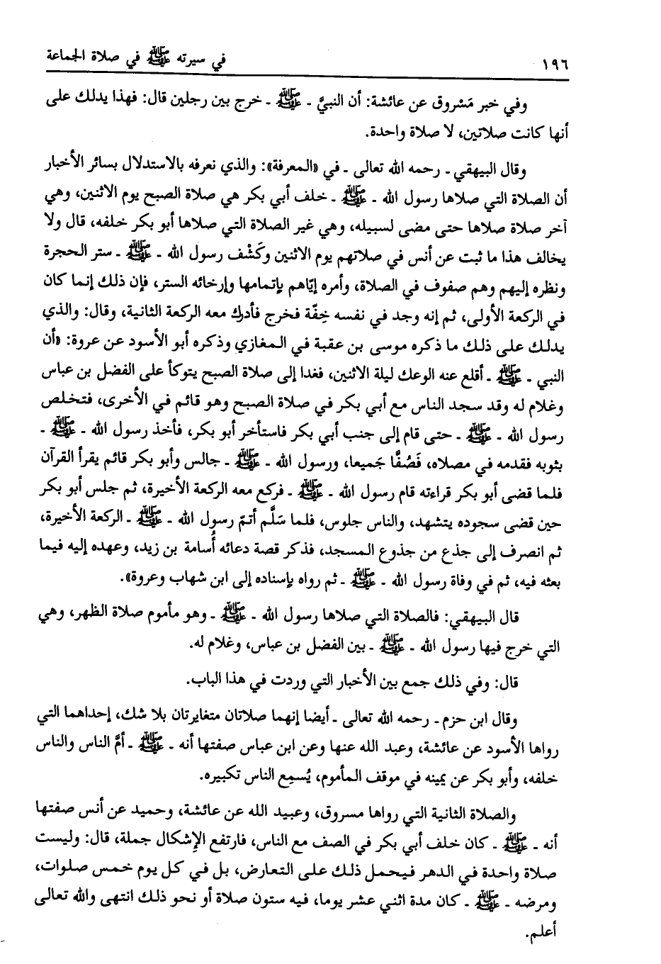 وقال ابن حزم- رحمه الله تعالى- أيضا إنهما صلاتان متغايرتان بلا شك، إحداهما التي رواها الأسود عن عائشة، وعبد الله عنها وعن ابن عباس صفتها أنه- صلى الله عليه وسلم- أم الناس والناس خلفه، وأبو بكر عن يمينه في موقف المأموم، يسمع الناس تكبيره.