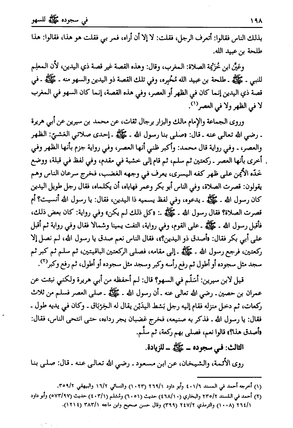 قيل لابن سيرين: أسلّم في السهو؟ قال: لم أحفظه من أبي هريرة ولكني نبئت عن عمران بن حصين- رضي الله تعالى عنه- أن رسول الله- صلى الله عليه وسلم- صلى العصر فسلم من ثلاث ركعات، ثم دخل منزله فقام إليه رجل بسط اليدين يقال له الخرباق- وكان في يديه طول- فقال: يا رسول الله- فذكر به صنيعه، فخرج غضبان يجر رداءه، حتى انتحى الناس، فقال: