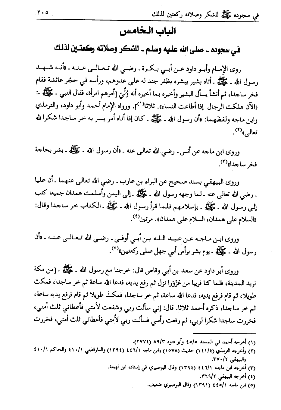 الباب الخامس في سجوده- صلى الله عليه وسلّم- للشكر وصلاته ركعتين لذلك
