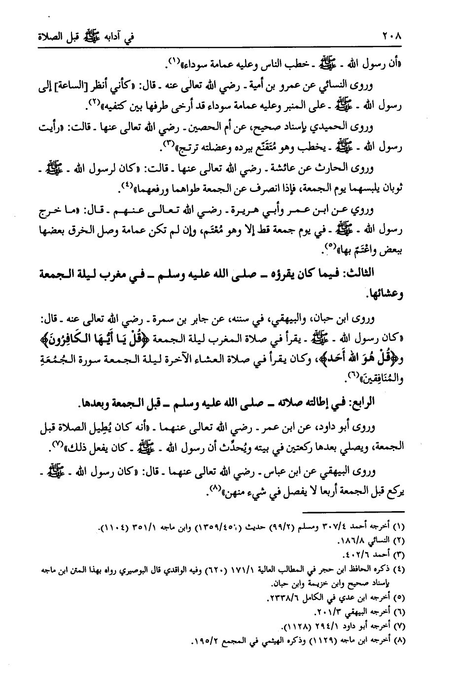 وروى البيهقي عن ابن عباس- رضي الله تعالى عنهما- قال: «كان رسول الله- صلى الله عليه وسلّم- يركع قبل الجمعة أربعا لا يفصل في شيء منهن» [ (8) ] .