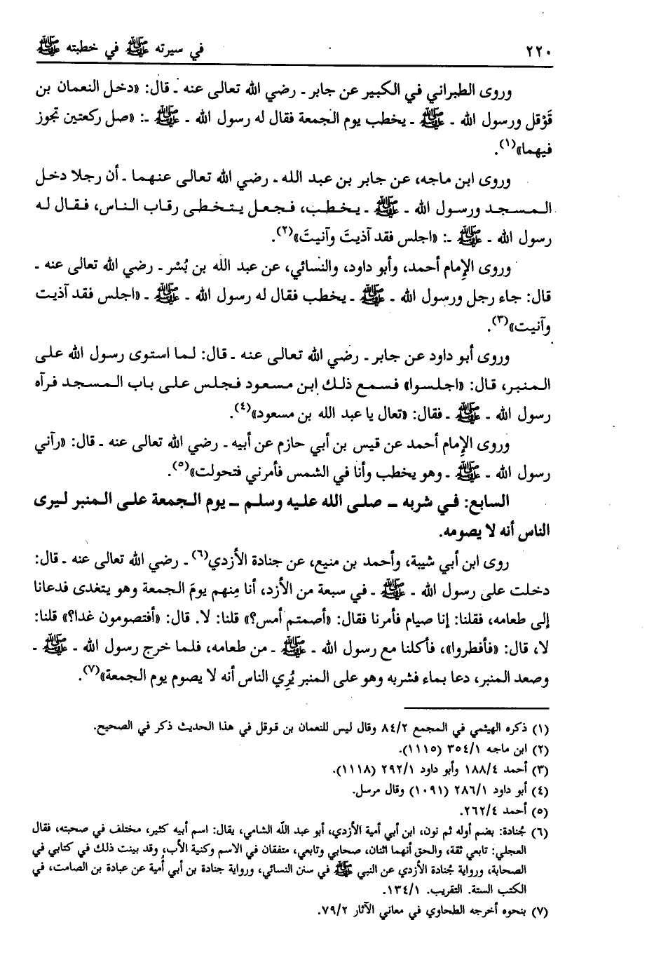 وروى ابن ماجه، عن جابر بن عبد الله- رضي الله تعالى عنهما- أن رجلا دخل المسجد ورسول الله- صلى الله عليه وسلم- يخطب، فجعل يتخطى رقاب الناس، فقال له رسول الله- صلى الله عليه وسلم-: «اجلس فقد آذيت وآنيت» [ (2) ] .