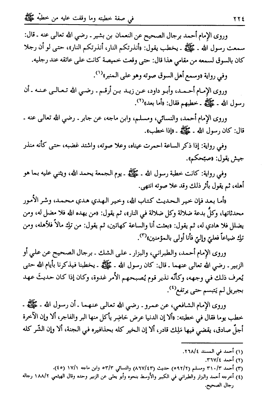 وروى الإمام أحمد برجال الصحيح عن النعمان بن بشير- رضي الله تعالى عنه- قال: سمعت رسول الله- صلى الله عليه وسلم- يخطب يقول: «أنذرتكم النار، أنذرتكم النار» ، حتى لو أن رجلا كان بالسوق لسمعه من مقامي هذا قال: حتى وقعت خميصة كانت على عاتقه عند رجليه.