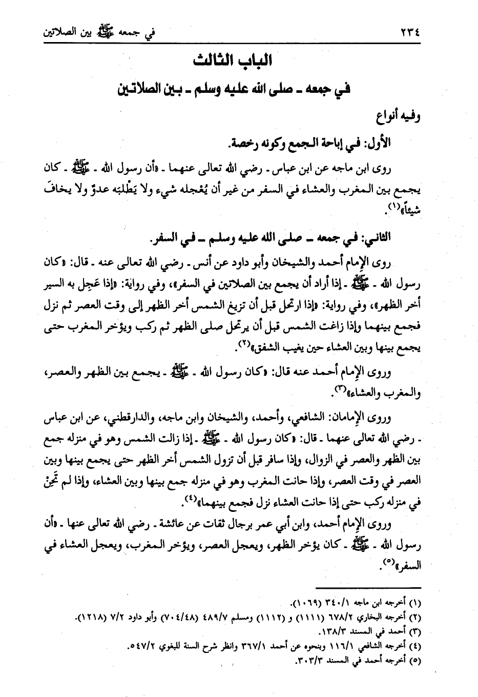 وروى الإمامان: الشافعي، وأحمد، والشيخان وابن ماجه، والدارقطني، عن ابن عباس- رضي الله تعالى عنهما- قال: «كان رسول الله- صلى الله عليه وسلم- إذا زالت الشمس وهو في منزله جمع بين الظهر والعصر في الزوال، وإذا سافر قبل أن تزول الشمس أخر الظهر حتى يجمع بينها وبين العصر في وقت العصر، وإذا حانت المغرب وهو في منزله جمع بينها وبين العشاء، وإذا لم تحن في منزله ركب حتى إذا حانت العشاء نزل فجمع بينهما» [ (4) ] .