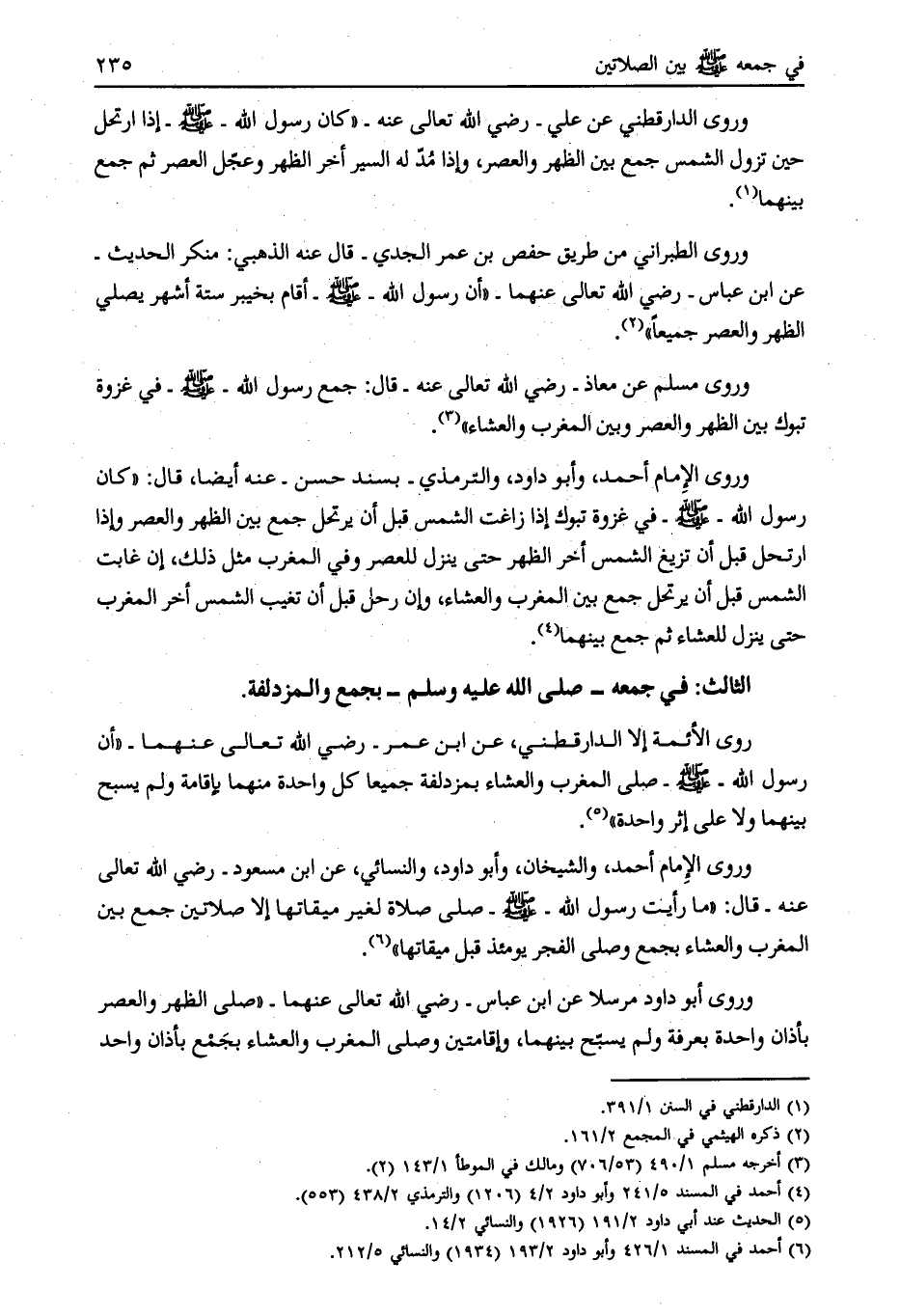 وروى الإمام أحمد، وأبو داود، والترمذي- بسند حسن- عنه أيضاً، قال: «كان رسول الله- صلى الله عليه وسلم- في غزوة تبوك إذا زاغت الشمس قبل أن يرتحل جمع بين الظهر والعصر وإذا ارتحل قبل أن تزيغ الشمس أخر الظهر حتى ينزل للعصر وفي المغرب مثل ذلك، أن غابت الشمس قبل أن يرتحل جمع بين المغرب والعشاء، وإن رحل قبل أن تغيب الشمس أخر المغرب حتى ينزل للعشاء ثم جمع بينهما [ (4) ] .