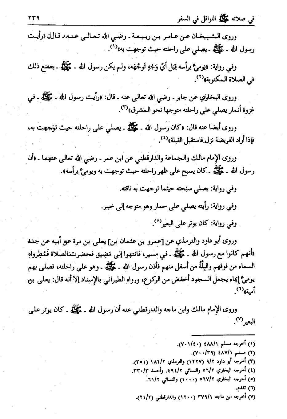 وروى الإمام مالك والجماعة والدارقطني عن ابن عمر- رضي الله تعالى عنهما- «أن رسول الله- صلى الله عليه وسلم- كان يسبح على ظهر راحلته حيث توجهت به ويومئ برأسه» .