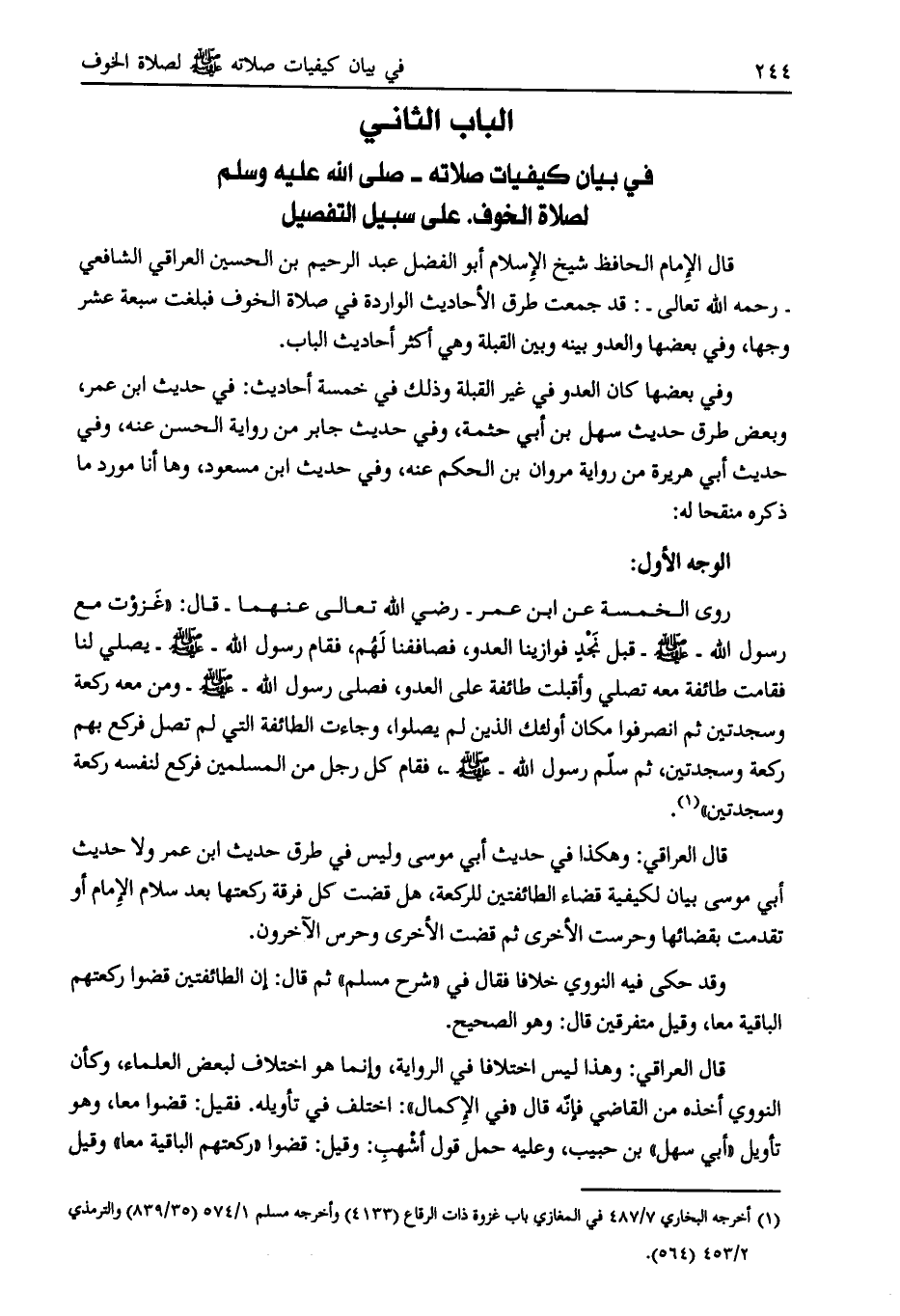 قال الإمام الحافظ شيخ الإسلام أبو الفضل عبد الرحيم بن الحسين العراقي الشافعي- رحمه الله تعالى-: قد جمعت طرق الأحاديث الواردة في صلاة الخوف فبلغت سبعة عشر وجها، وفي بعضها والعدو بينه وبين القبلة وهي أكثر أحاديث الباب.
