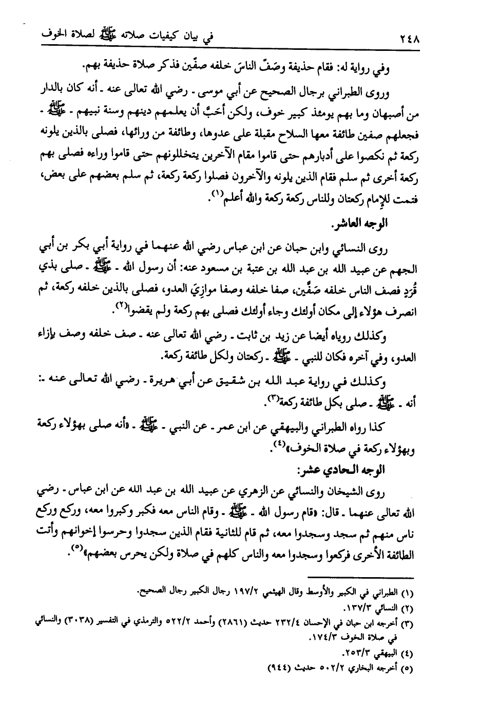 وروى الطبراني برجال الصحيح عن أبي موسى- رضي الله تعالى عنه- أنه كان بالدار من أصبهان وما بهم يومئذ كبير خوف، ولكن أحبّ أن يعلمهم دينهم وسنة نبيهم- صلى الله عليه وسلّم- فجعلهم صفين طائفة معها السلاح مقبلة على عدوها، وطائفة من ورائها، فصلى بالذين يلونه ركعة ثم نكصوا على أدبارهم حتى قاموا مقام الآخرين يتخللونهم حتى قاموا وراءه فصلى بهم ركعة أخرى ثم سلم فقام الذين يلونه والآخرون فصلوا ركعة ركعة، ثم سلم بعضهم على بعض، فتمت للإمام ركعتان وللناس ركعة ركعة والله أعلم [ (1) ] .