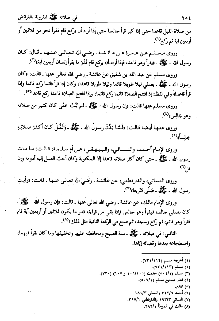 وروى مسلم عنها قالت: «إن رسول الله- صلى الله عليه وسلم- لم يمت حتى كان كثير من صلاته وهو جالس» [ (4) ] .