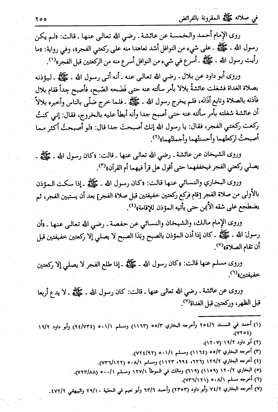وروى مسلم عنها قالت: «كان رسول الله- صلى الله عليه وسلم- إذا طلع الفجر لا يصلي إلا ركعتين خفيفتين» [ (6) ] .