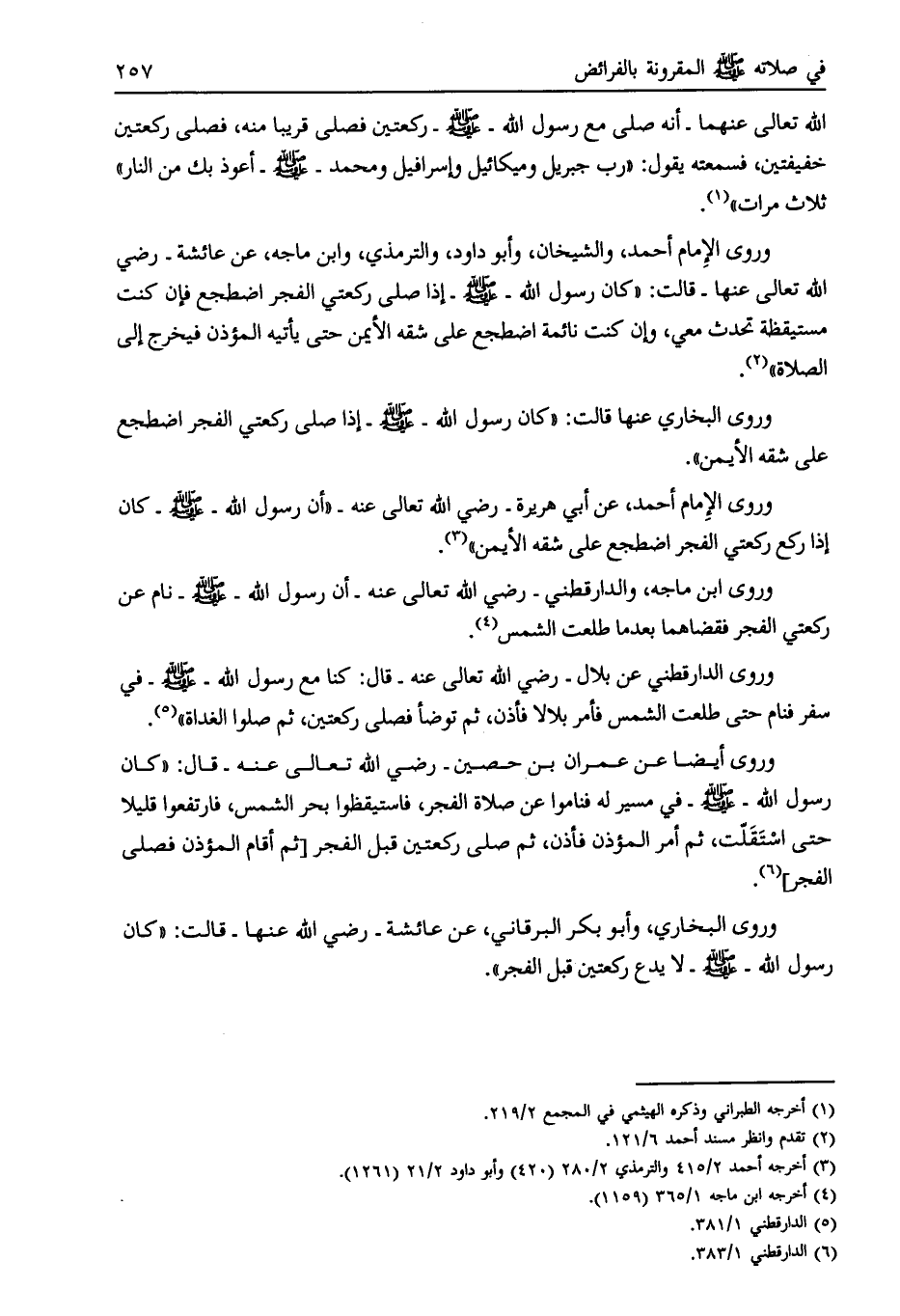 وروى الإمام أحمد، والشيخان، وأبو داود، والترمذي، وابن ماجة، عن عائشة- رضي الله تعالى عنها- قالت: «كان رسول الله- صلى الله عليه وسلم- إذا صلى ركعتي الفجر اضطجع فإن كنت مستيقظة تحدث معي، وإن كنت نائمة اضطجع على شقه الأيمن حتى يأتيه المؤذن فيخرج إلى الصلاة» [ (2) ] .