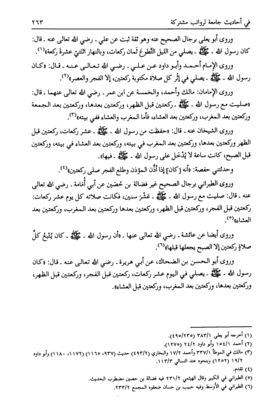 وروى أيضا عن عائشة- رضي الله تعالى عنها- «أن رسول الله- صلى الله عليه وسلم- كان يتبع كلّ صلاة ركعتين إلا الصبح يجعلها قبلها» [ (6) ] .