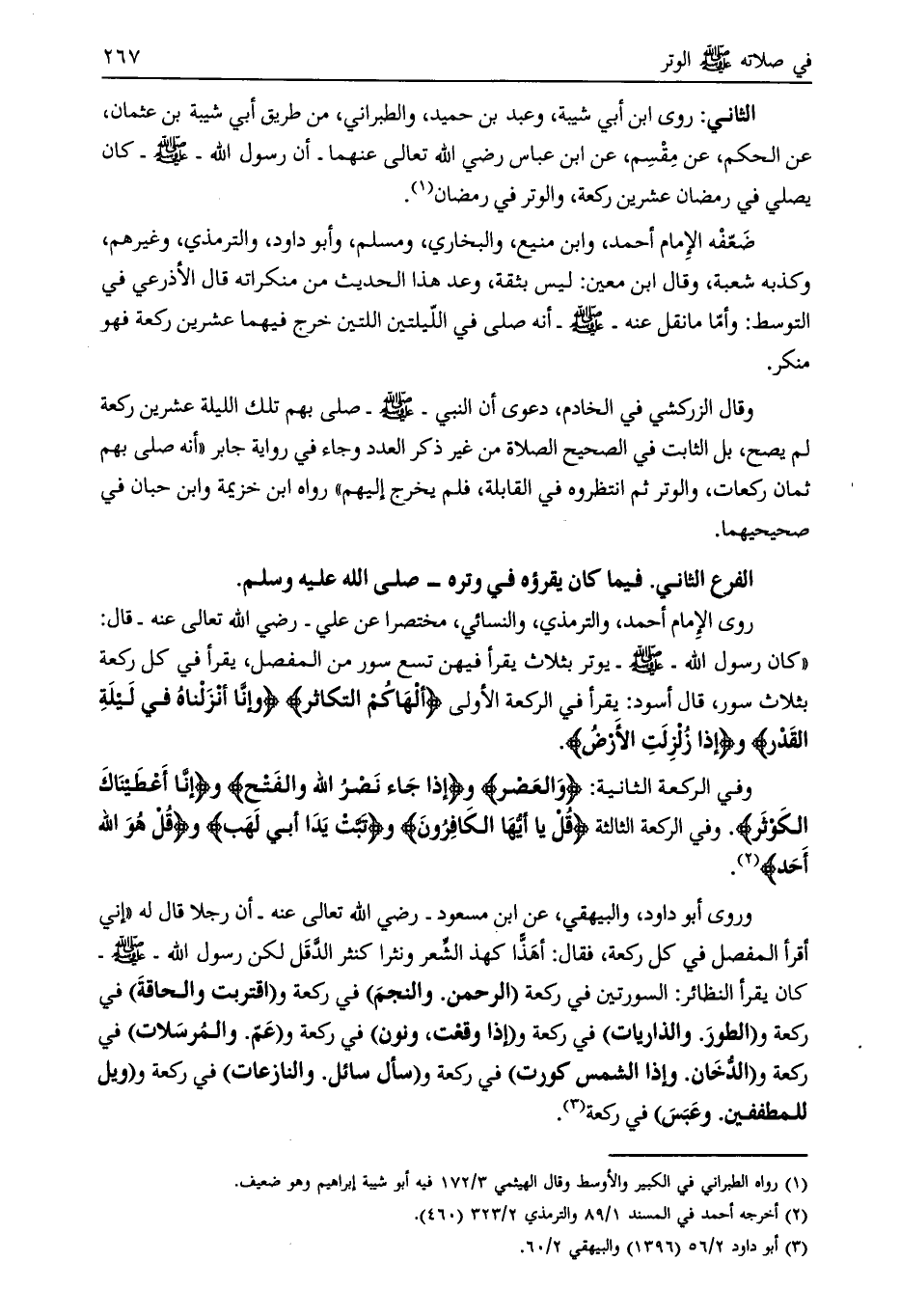 روى الإمام أحمد، والترمذي، والنسائي، مختصرا عن علي- رضي الله تعالى عنه- قال: «كان رسول الله- صلى الله عليه وسلّم- يوتر بثلاث يقرأ فيهن تسع سور من المفصل، يقرأ في كل ركعة بثلاث سور، قال أسود: يقرأ في الركعة الأولى أَلْهاكُمُ التَّكاثُرُ وإِنَّا أَنْزَلْناهُ فِي لَيْلَةِ الْقَدْرِ وإِذا زُلْزِلَتِ الْأَرْضُ.