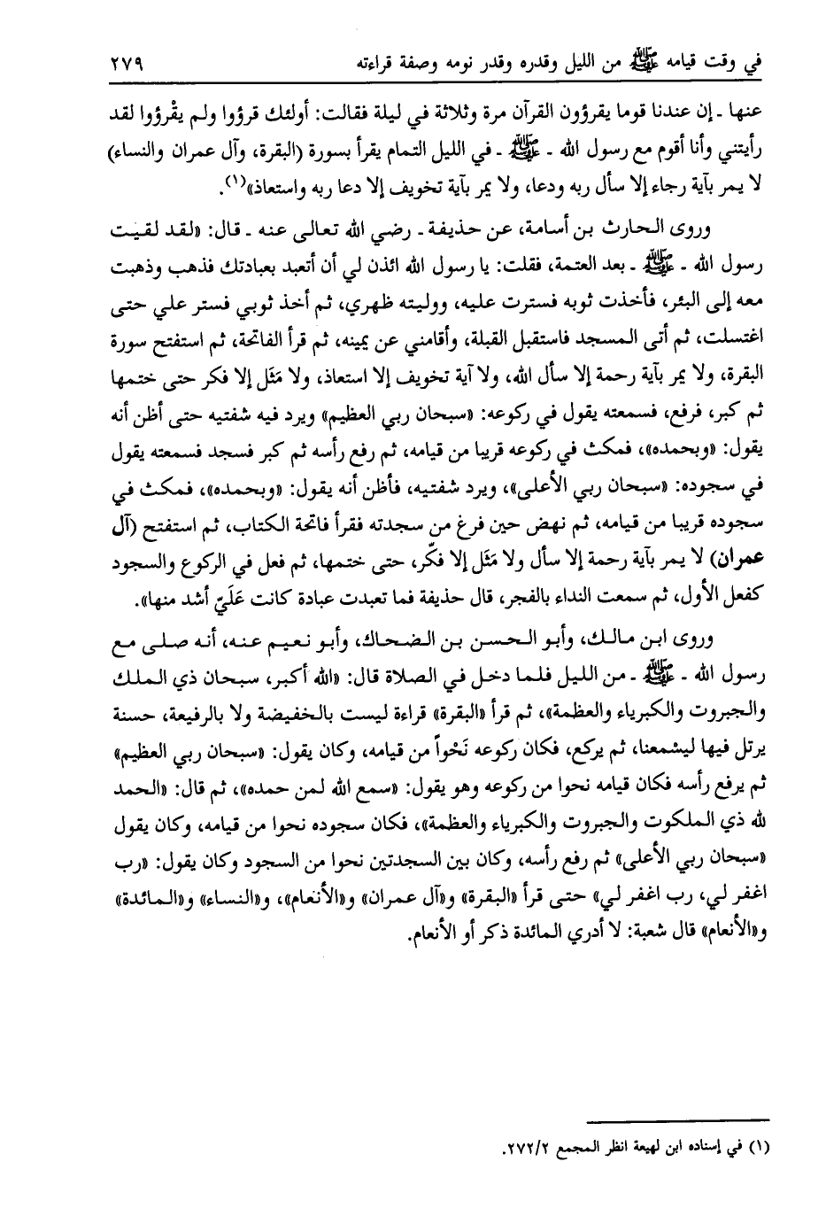 وروى الحارث بن أسامة، عن حذيفة- رضي الله تعالى عنه- قال: «لقد لقيت رسول الله- صلى الله عليه وسلّم- بعد العتمة، فقلت: يا رسول الله ائذن لي أن أتعبد بعبادتك فذهب وذهبت معه إلى البئر، فأخذت ثوبه فسترت عليه، ووليته ظهري، ثم أخذ ثوبي فستر علي حتى اغتسلت، ثم أتى المسجد فاستقبل القبلة، وأقامني عن يمينه، ثم قرأ الفاتحة، ثم استفتح سورة البقرة، ولا يمر بآية رحمة إلا سأل الله، ولا آية تخويف إلا استعاذ، ولا مثل إلا فكر حتى ختمها ثم كبر، فرفع، فسمعته يقول في ركوعه: «سبحان ربي العظيم» ويرد فيه شفتيه حتى أظن أنه يقول: «وبحمده» ، فمكث في ركوعه قريبا من قيامه، ثم رفع رأسه ثم كبر فسجد فسمعته يقول في سجوده: «سبحان ربي الأعلى» ، ويرد شفتيه، فأظن أنه يقول: «وبحمده» ، فمكث في سجوده قريبا من قيامه، ثم نهض حين فرغ من سجدته فقرأ فاتحة الكتاب، ثم استفتح (آل عمران) لا يمر بآية رحمة إلا سأل ولا مثل إلا فكّر، حتى ختمها، ثم فعل في الركوع والسجود كفعل الأول، ثم سمعت النداء بالفجر، قال حذيفة فما تعبدت عبادة كانت عليّ أشد منها» .