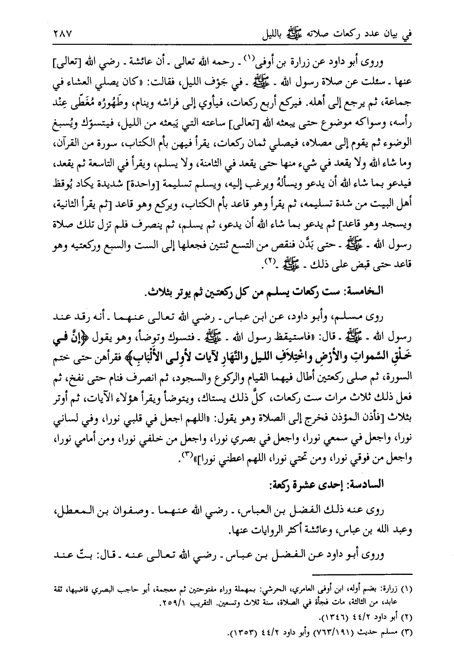 وروى أبو داود عن زرارة بن أوفى [ (1) ]- رحمه الله تعالى- أن عائشة- رضي الله [تعالى] عنها- سئلت عن صلاة رسول الله- صلى الله عليه وسلم- في جوف الليل، فقالت: «كان يصلي العشاء في جماعة، ثم يرجع إلى أهله. فيركع أربع ركعات، فيأوي إلى فراشه وينام، وطهوره مغطّى عند رأسه، وسواكه موضوع حتى يبعثه الله [تعالى] ساعته التي يبعثه من الليل، فيتسوّك ويسبغ الوضوء ثم يقوم إلى مصلاه، فيصلي ثمان ركعات، يقرأ فيهن بأم الكتاب، سورة من القرآن، وما شاء الله ولا يقعد في شيء منها حتى يقعد في الثامنة، ولا يسلم، ويقرأ في التاسعة ثم يقعد، فيدعو بما شاء الله أن يدعو ويسأله ويرغب إليه، ويسلم تسليمة [واحدة] شديدة يكاد يوقظ أهل البيت من شدة تسليمه، ثم يقرأ وهو قاعد بأم الكتاب، ويركع وهو قاعد [ثم يقرأ الثانية، ويسجد وهو قاعد] ثم يدعو بما شاء الله أن يدعو، ثم يسلم، ثم ينصرف فلم تزل تلك صلاة رسول الله- صلى الله عليه وسلم- حتى بدّن فنقص من التسع ثنتين فجعلها إلى الست والسبع وركعتيه وهو قاعد حتى قبض على ذلك- صلى الله عليه وسلّم-[ (2) ] .