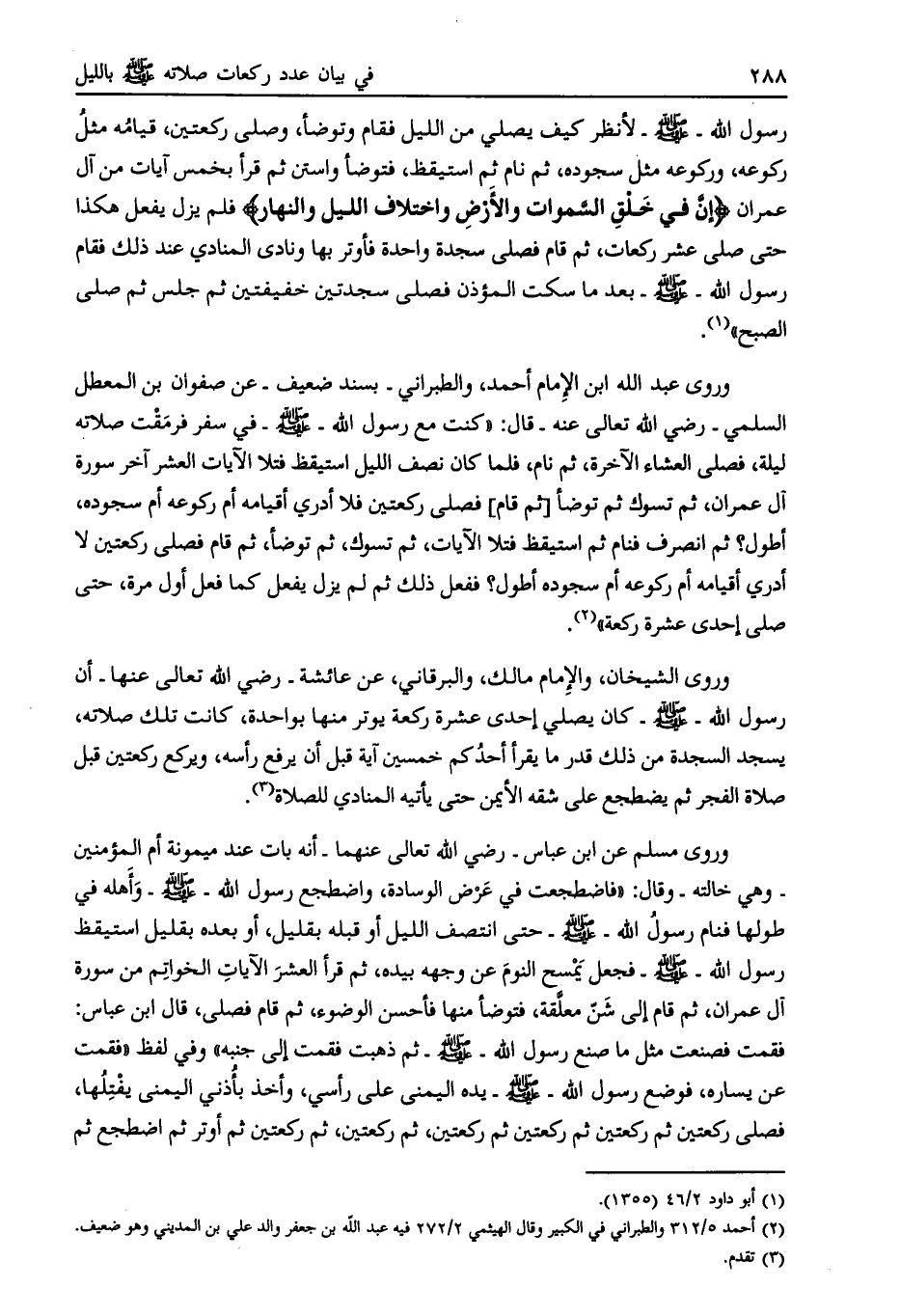 وروى عبد الله ابن الإمام أحمد، والطبراني- بسند ضعيف- عن صفوان بن المعطل السّلمي- رضي الله تعالى عنه- قال: «كنت مع رسول الله- صلى الله عليه وسلم- في سفر فرمقت صلاته ليلة، فصلى العشاء الآخرة، ثم نام، فلما كان نصف الليل استيقظ فتلا الآيات العشر آخر سورة آل عمران، ثم تسوك ثم توضأ [ثم قام] فصلى ركعتين فلا أدري أقيامه أم ركوعه أم سجوده، أطول؟ ثم انصرف فنام ثم استيقظ فتلا الآيات، ثم تسوك، ثم توضأ، ثم قام فصلى ركعتين لا أدري أقيامه أم ركوعه أم سجوده أطول؟ ففعل ذلك ثم لم يزل يفعل كما فعل أول مرة، حتى صلى إحدى عشرة ركعة» [ (2) ] .