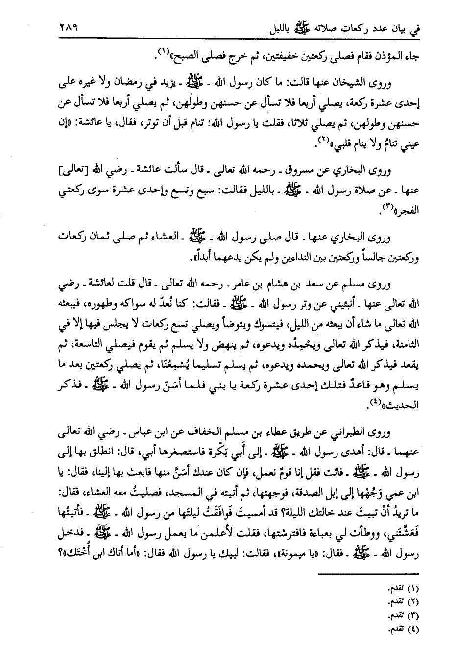 وروى الشيخان عنها قالت: ما كان رسول الله- صلى الله عليه وسلم- يزيد في رمضان ولا غيره على إحدى عشرة ركعة، يصلي أربعا فلا تسأل عن حسنهن وطولهن، ثم يصلي أربعا فلا تسأل عن حسنهن وطولهن، ثم يصلي ثلاثا، فقلت يا رسول الله: تنام قبل أن توتر، فقال، يا عائشة: «إن عيني تنام ولا ينام قلبي» [ (2) ] .