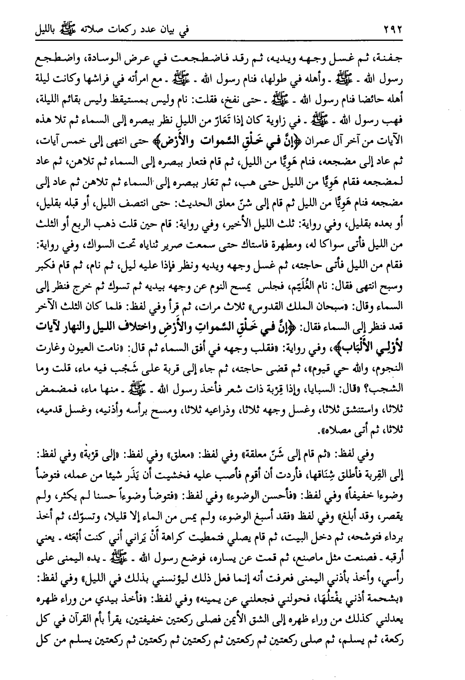 جفنة، ثم غسل وجهه ويديه، ثم رقد فاضطجعت في عرض الوسادة، واضطجع رسول الله- صلى الله عليه وسلم- وأهله في طولها، فنام رسول الله- صلى الله عليه وسلّم- مع امرأته في فراشها وكانت ليلة أهله حائضا فنام رسول الله- صلى الله عليه وسلّم- حتى نفخ، فقلت: نام وليس بمستيقظ وليس بقائم الليلة، فهب رسول الله- صلى الله عليه وسلم- في زاوية كان إذا تعارّ من الليل نظر ببصره إلى السماء ثم تلا هذه الآيات من آخر آل عمران إِنَّ فِي خَلْقِ السَّماواتِ وَالْأَرْضِ حتى انتهى إلى خمس آيات، ثم عاد إلى مضجعه، فنام هويّا من الليل، ثم قام فتعار ببصره إلى السماء ثم تلاهن، ثم عاد لمضجعه فقام هويّا من الليل حتى هب، ثم تعار ببصره إلى السماء ثم تلاهن ثم عاد إلى مضجعه فنام هويّا من الليل ثم قام طلى شنّ معلق الحديث: حتى انتصف الليل، أو قبله بقليل، أو بعده بقليل، وفي رواية: ثلث الليل الأخير، وفي رواية: قام حين قلت ذهب الربع أو الثلث من الليل فأتى سواكا له، ومطهرة فاستاك حتى سمعت صرير ثناياه تحت السواك، وفي رواية: