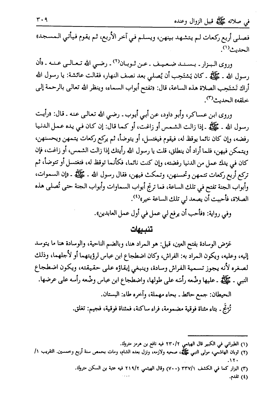 وروى البزار- بسند ضعيف- عن ثوبان [ (2) ]- رضي الله تعالى عنه- «أن رسول الله- صلى الله عليه وسلّم- كان يستحب أن يصلي بعد نصف النهار، فقالت عائشة: يا رسول الله أراك تستحب الصلاة هذه الساعة، قال: «تفتح أبواب السماء، وينظر الله تعالى بالرحمة إلى خلقه» الحديث [ (3) ] .