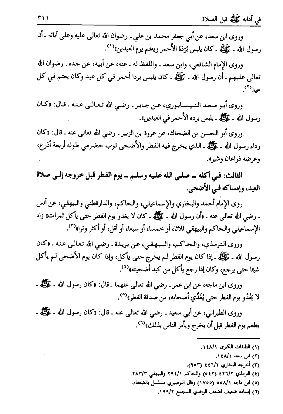 وروى ابن سعد، عن أبي جعفر محمد بن علي- رضوان الله تعالى عليه وعلى آبائه- أن رسول الله- صلى الله عليه وسلّم- كان يلبس برده الأحمر ويعتم يوم العيدين» [ (1) ] .