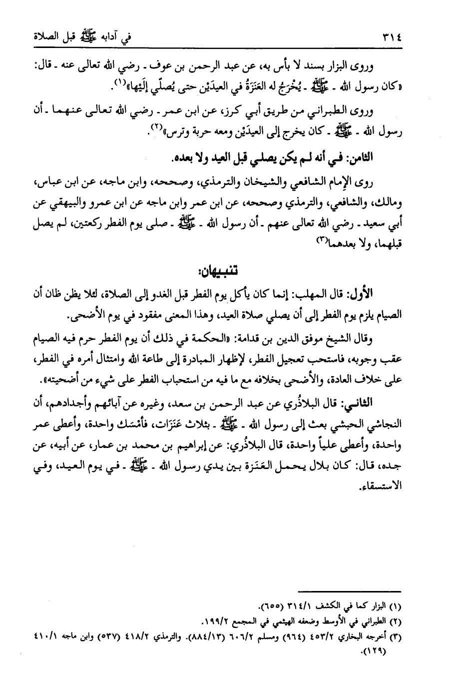 روى الإمام الشافعي والشيخان والترمذي، وصححه، وابن ماجه، عن ابن عباس، ومالك، والشافعي، والترمذي وصححه، عن ابن عمر وابن ماجه عن ابن عمرو والبيهقي عن أبي سعيد- رضي الله تعالى عنهم- أن رسول الله- صلى الله عليه وسلم- صلى يوم الفطر ركعتين، لم يصل قبلهما، ولا بعدهما [ (3) ]