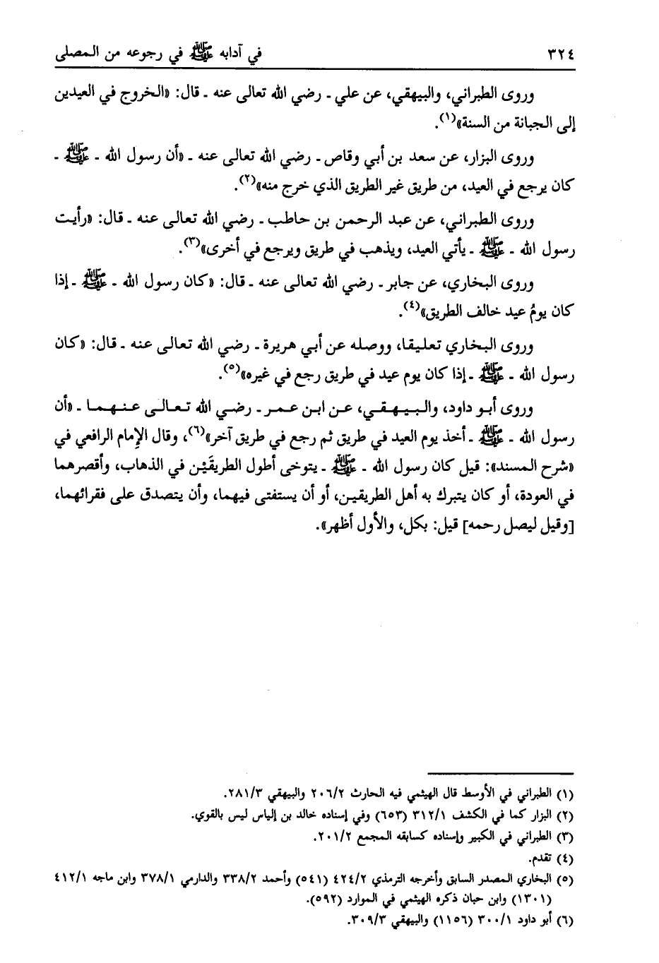 وروى البزار، عن سعد بن أبي وقاص- رضي الله تعالى عنه- «أن رسول الله- صلى الله عليه وسلم- كان يرجع في العيد، من طريق غير الطريق الذي خرج منه» [ (2) ] .