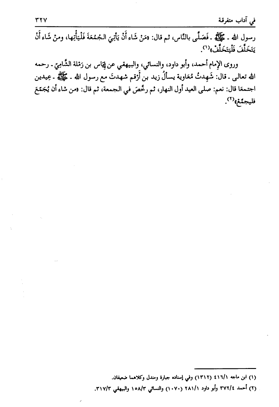 وروى الإمام أحمد، وأبو داود، والنسائي، والبيهقي عن إياس بن رملة الشّامي- رحمه الله تعالى- قال: شهدت معاوية يسأل زيد بن أرقم شهدت مع رسول الله- صلى الله عليه وسلّم- عيدين اجتمعا قال: نعم: صلى العيد أول النهار، ثم رخّص في الجمعة، ثم قال: «من شاء أن يجمّع فليجمّع» [ (2) ] .