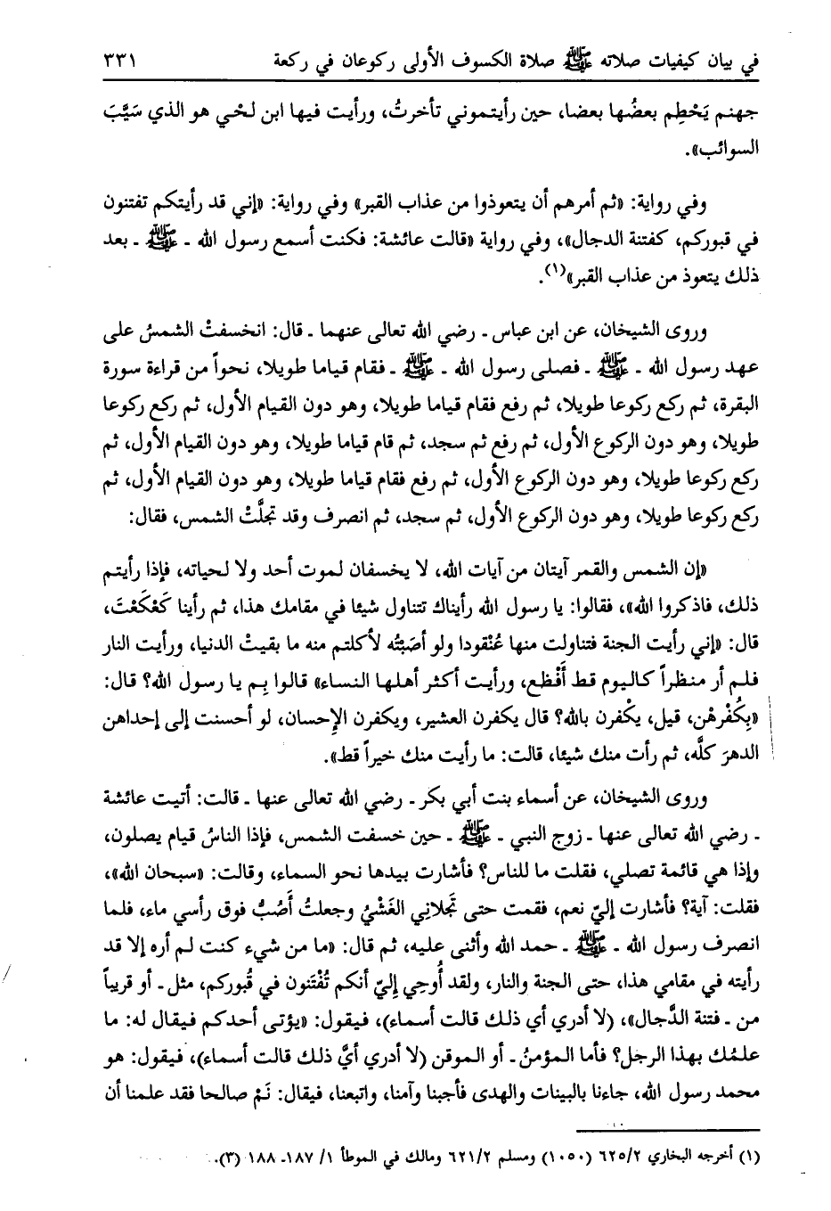 وروى الشيخان، عن ابن عباس- رضي الله تعالى عنهما- قال: انخسفت الشمس على عهد رسول الله- صلى الله عليه وسلم- فصلى رسول الله- صلى الله عليه وسلّم- فقام قياما طويلا، نحوا من قراءة سورة البقرة، ثم ركع ركوعا طويلا، ثم رفع فقام قياما طويلا، وهو دون القيام الأول، ثم ركع ركوعا طويلا، وهو دون الركوع الأول، ثم رفع ثم سجد، ثم قام قياما طويلا، وهو دون القيام الأول، ثم ركع ركوعا طويلا، وهو دون الركوع الأول، ثم رفع فقام قياما طويلا، وهو دون القيام الأول، ثم ركع ركوعا طويلا، وهو دون الركوع الأول، ثم سجد، ثم انصرف وقد تجلّت الشمس، فقال: