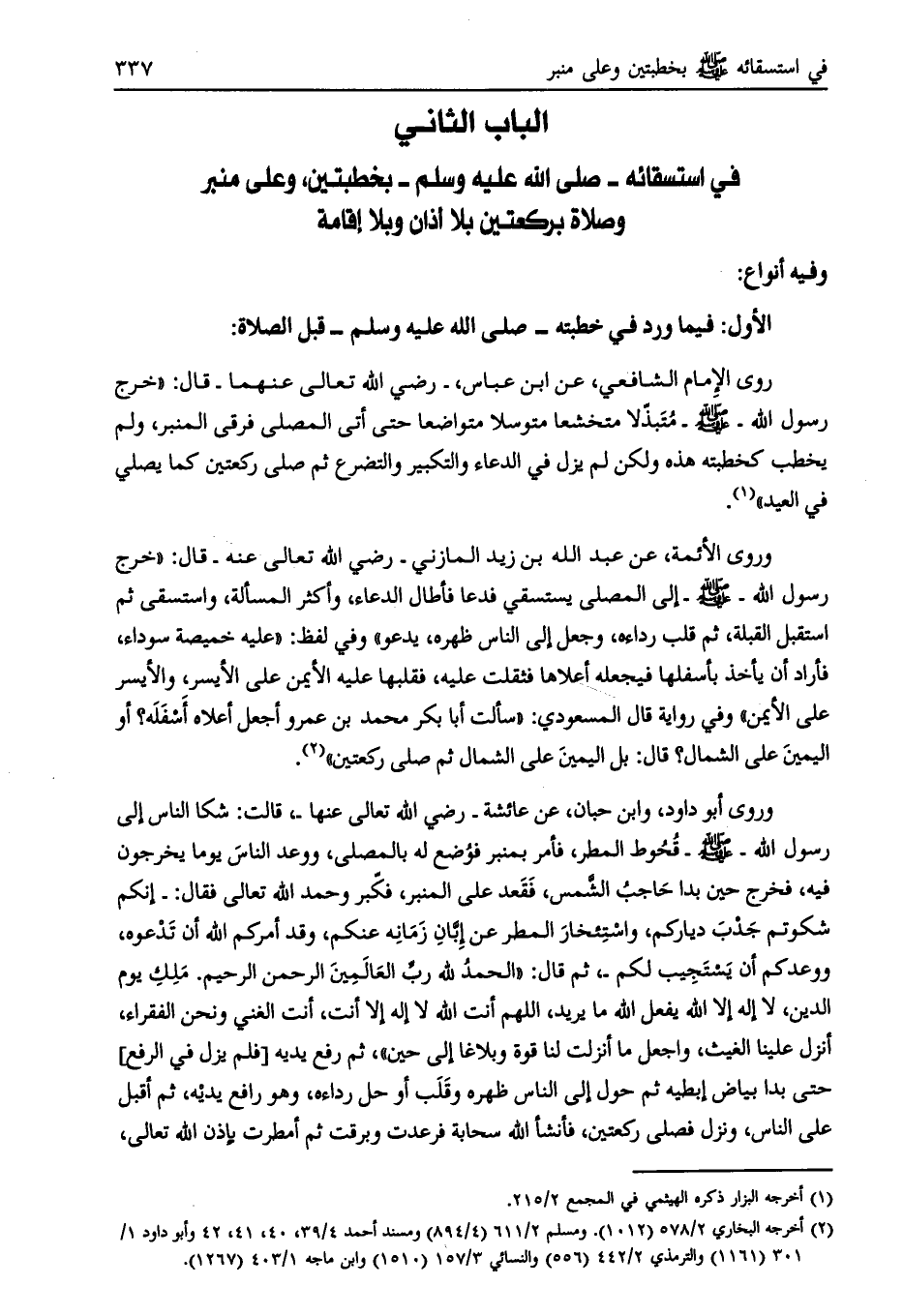 الباب الثاني في استسقائه- صلّى الله عليه وسلّم- بخطبتين، وعلى منبر وصلاة بركعتين بلا أذان وبلا إقامة