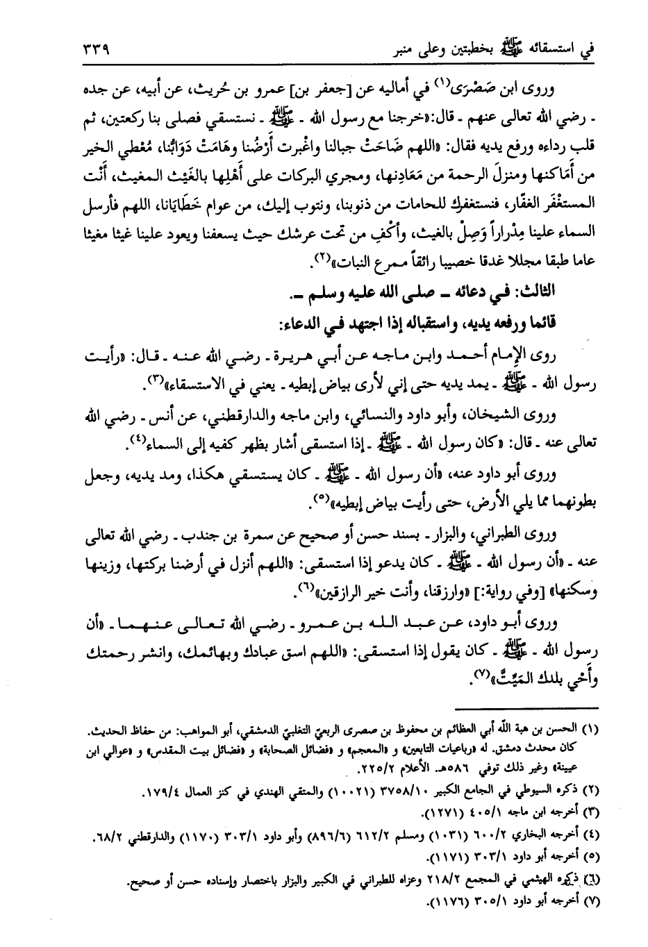وروى أبو داود عنه، «أن رسول الله- صلى الله عليه وسلّم- كان يستسقي هكذا، ومد يديه، وجعل بطونهما مما يلي الأرض، حتى رأيت بياض إبطيه» [ (5) ] .