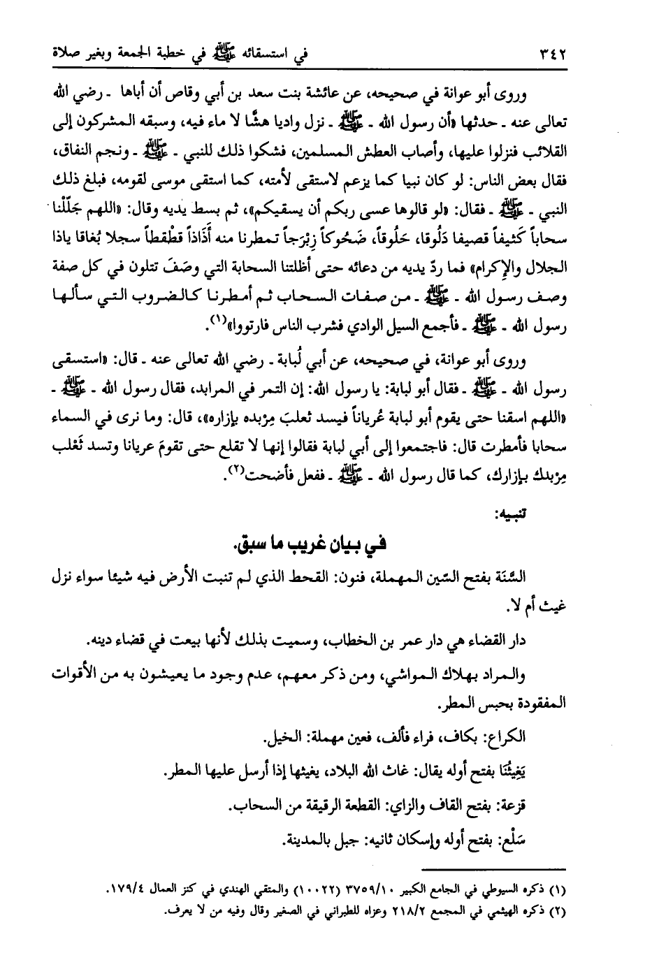 وروى أبو عوانة، في صحيحه، عن أبي لبابة- رضي الله تعالى عنه- قال: «استسقى رسول الله- صلى الله عليه وسلم- فقال أبو لبابة: يا رسول الله: إن التمر في المرابد، فقال رسول الله- صلى الله عليه وسلّم- «اللهم اسقنا حتى يقوم أبو لبابة عريانا فيسد ثعلب مربده بإزاره» ، قال: وما نرى في السماء سحابا فأمطرت قال: فاجتمعوا إلى أبي لبابة فقالوا إنها لا تقلع حتى تقوم عريانا وتسد ثعلب مربدك بإزارك، كما قال رسول الله- صلى الله عليه وسلّم- ففعل فأضحت [ (2) ] .