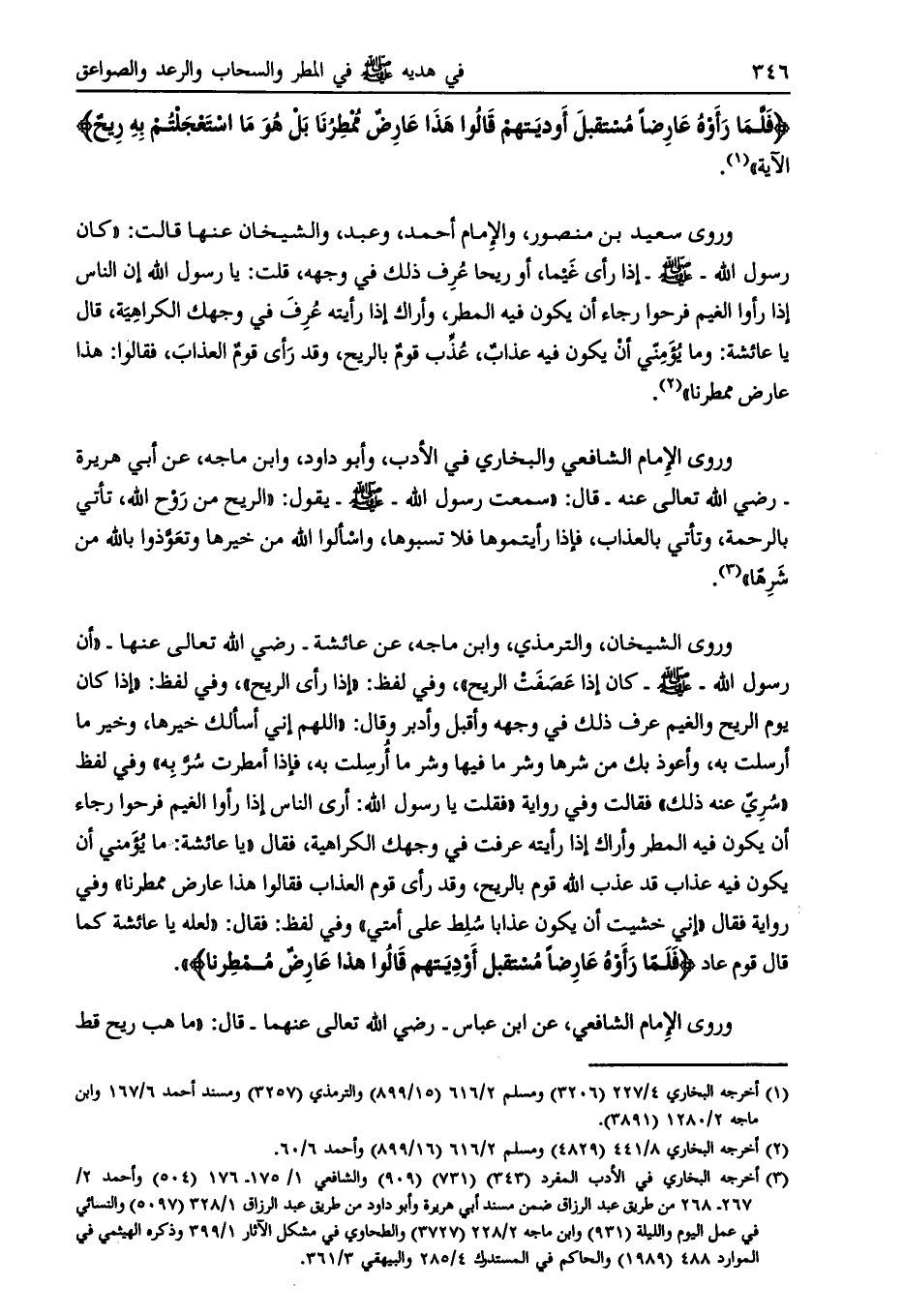 وروى سعيد بن منصور، والإمام أحمد، وعبد، والشيخان عنها قالت: «كان رسول الله- صلى الله عليه وسلم- إذا رأى غيما، أو ريحا عرف ذلك في وجهه، قلت: يا رسول الله إن الناس إذا رأوا الغيم فرحوا رجاء أن يكون فيه المطر، وأراك إذا رأيته عرف في وجهك الكراهية، قال يا عائشة: وما يؤمنّي أن يكون فيه عذاب، عذّب قوم بالريح، وقد رأى قوم العذاب، فقالوا: هذا عارض ممطرنا» [ (2) ] .