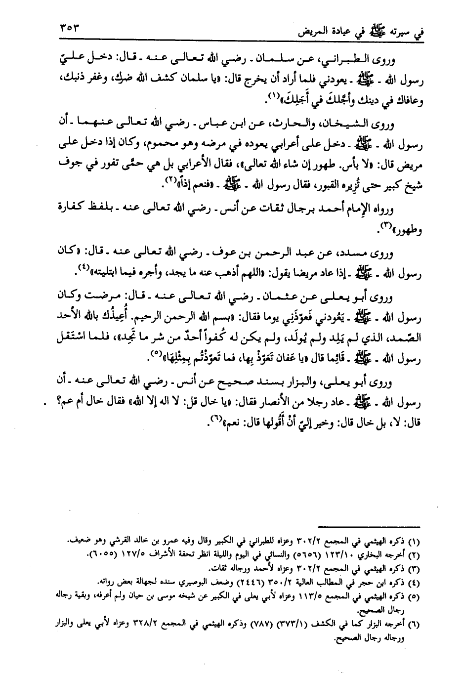 وروى الشيخان، والحارث، عن ابن عباس- رضي الله تعالى عنهما- أن رسول الله- صلى الله عليه وسلم- دخل على أعرابي يعوده في مرضه وهو محموم، وكان إذا دخل على مريض قال: «لا بأس. طهور إن شاء الله تعالى» ، فقال الأعرابي بل هي حمّى تفور في جوف شيخ كبير حتى تزيره القبور، فقال رسول الله- صلى الله عليه وسلّم- «فنعم إذا» [ (2) ] .