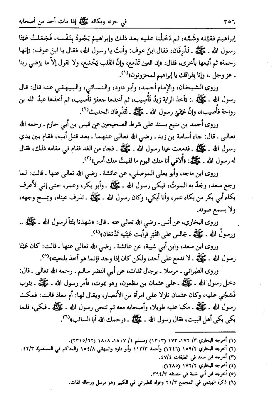 وروى البخاري، عن أنس- رضي الله تعالى عنه- قال: «شهدنا بنتا لرسول الله- صلى الله عليه وسلم- ورسول الله- صلى الله عليه وسلم- جالس على القبر فرأيت عينيه تدمعان» [ (4) ] .