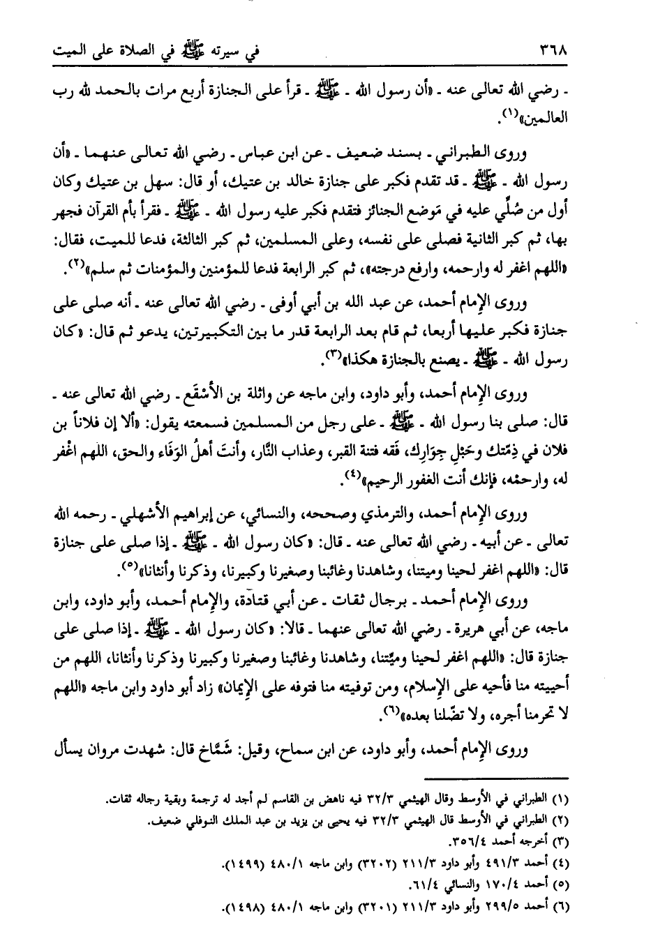 وروى الإمام أحمد، عن عبد الله بن أبي أوفى- رضي الله تعالى عنه- أنه صلى على جنازة فكبر عليها أربعا، ثم قام بعد الرابعة قدر ما بين التكبيرتين، يدعو ثم قال: «كان رسول الله- صلى الله عليه وسلم- يصنع بالجنازة هكذا» [ (3) ] .