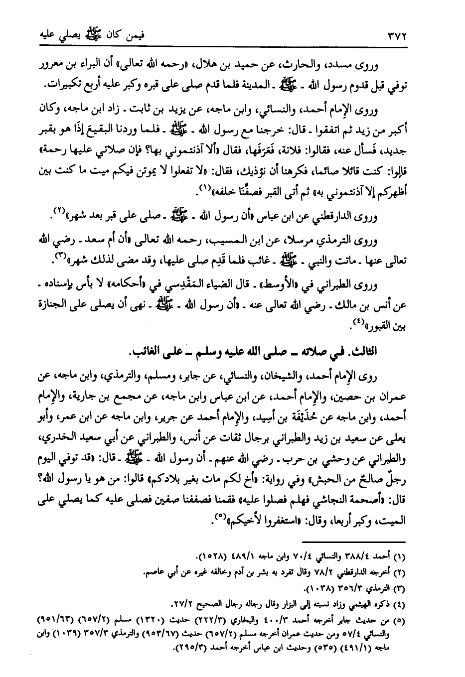 وروى الترمذي مرسلا، عن ابن المسيب، رحمه الله تعالى «أن أم سعد- رضي الله تعالى عنها- ماتت والنبي- صلى الله عليه وسلّم- غائب فلما قدم صلى عليها، وقد مضى لذلك شهر» [ (3) ] .
