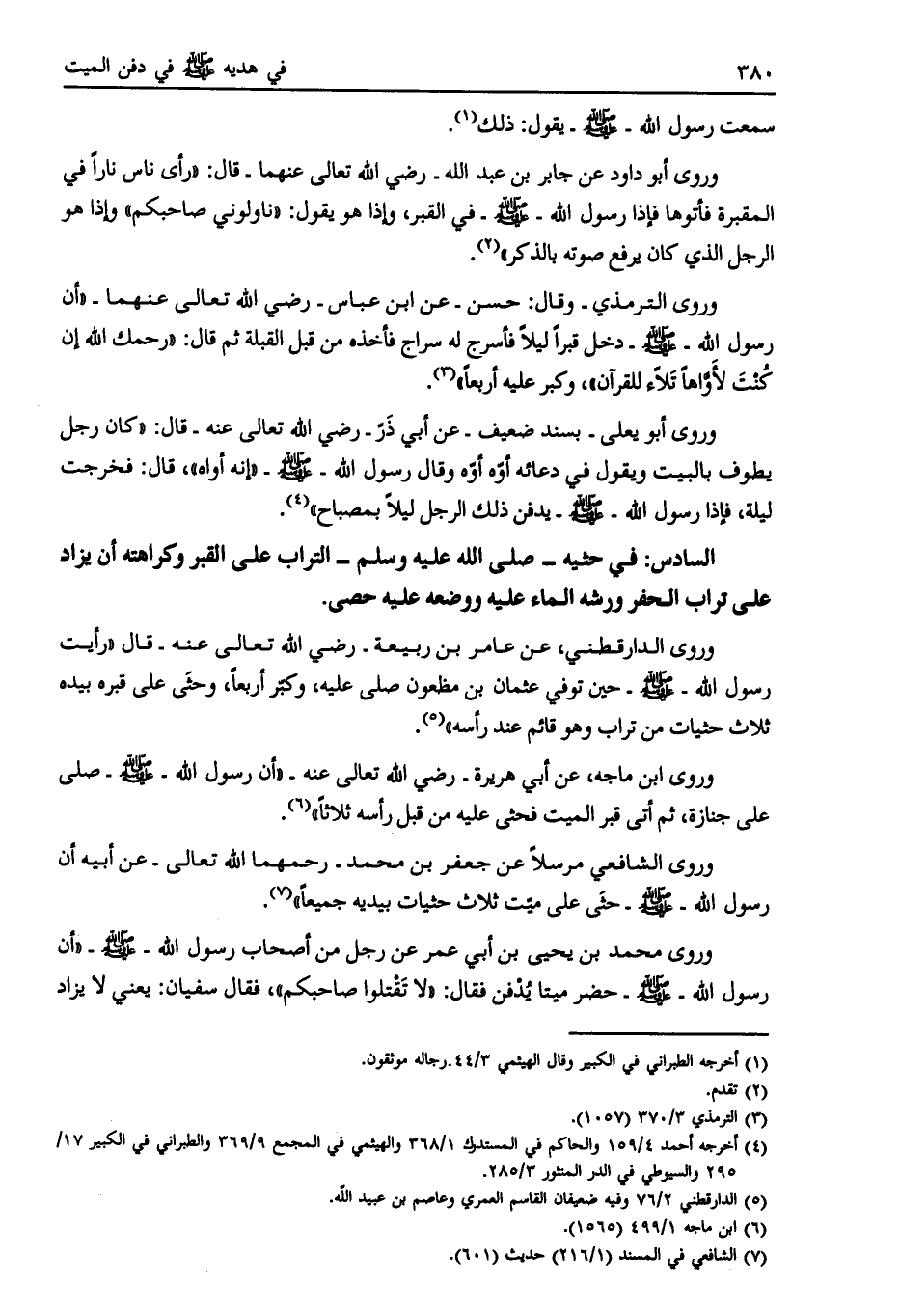 وروى الدارقطني، عن عامر بن ربيعة- رضي الله تعالى عنه- قال «رأيت رسول الله- صلى الله عليه وسلّم- حين توفي عثمان بن مظعون صلّى عليه، وكبّر أربعا، وحثى على قبره بيده ثلاث حثيات من تراب وهو قائم عند رأسه» [ (5) ] .