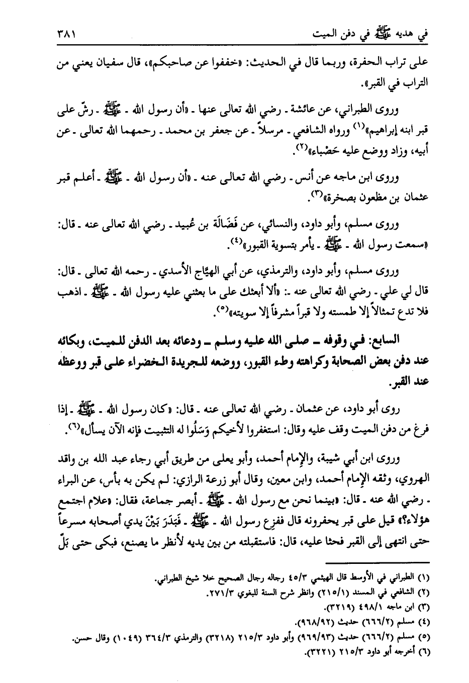 السابع: في وقوفه- صلى الله عليه وسلّم- ودعائه بعد الدفن للميت، وبكائه عند دفن بعض الصحابة وكراهته وطء القبور، ووضعه للجريدة الخضراء على قبر ووعظه عند القبر.
