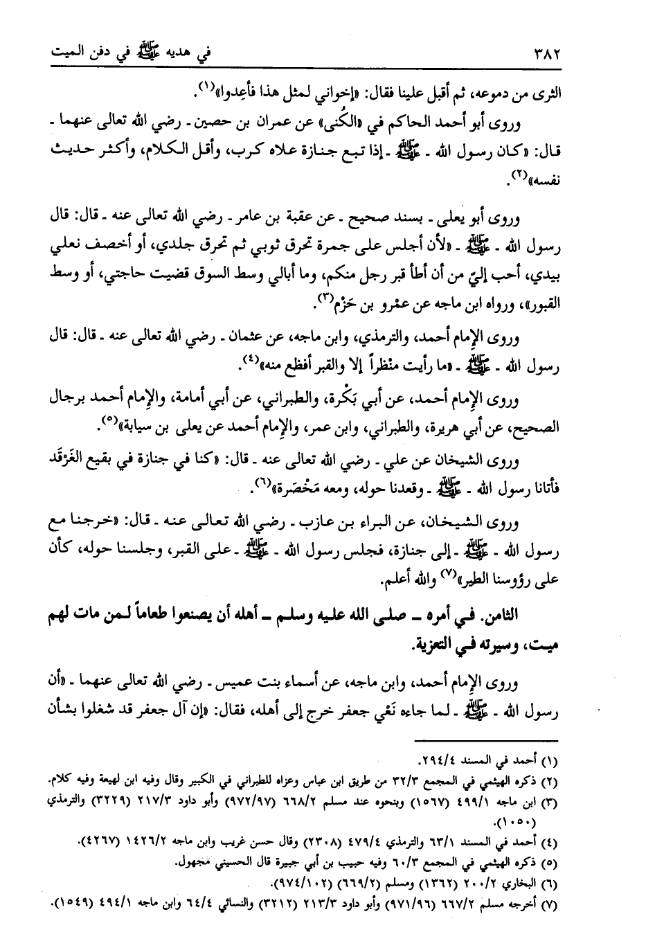 الثامن. في أمره- صلى الله عليه وسلم- أهله أن يصنعوا طعاما لمن مات لهم ميت، وسيرته في التعزية.