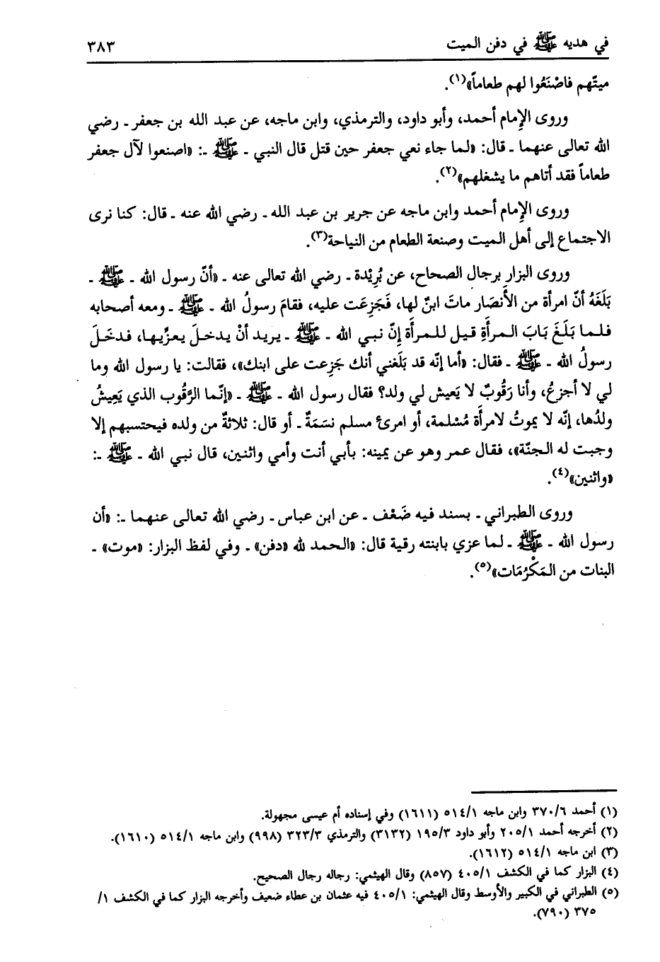 وروى الإمام أحمد، وأبو داود، والترمذي، وابن ماجة، عن عبد الله بن جعفر- رضي الله تعالى عنهما- قال: «لما جاء نعي جعفر حين قتل قال النبي- صلى الله عليه وسلم-: «اصنعوا لآل جعفر طعاما فقد أتاهم ما يشغلهم» [ (2) ] .