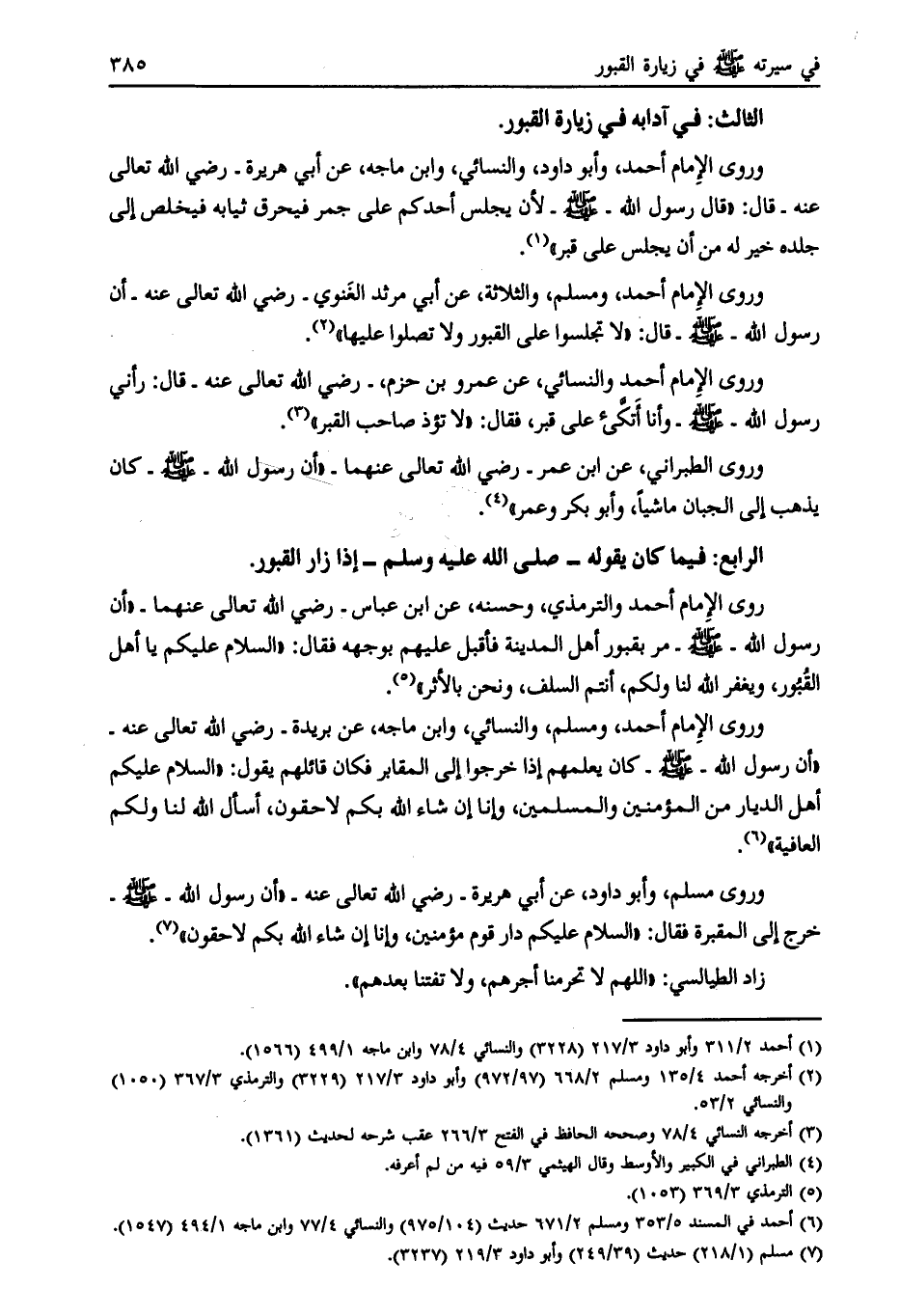 وروى مسلم، وأبو داود، عن أبي هريرة- رضي الله تعالى عنه- «أن رسول الله- صلى الله عليه وسلم- خرج إلى المقبرة فقال: «السلام عليكم دار قوم مؤمنين، وإنا إن شاء الله بكم لاحقون» [ (7) ] .