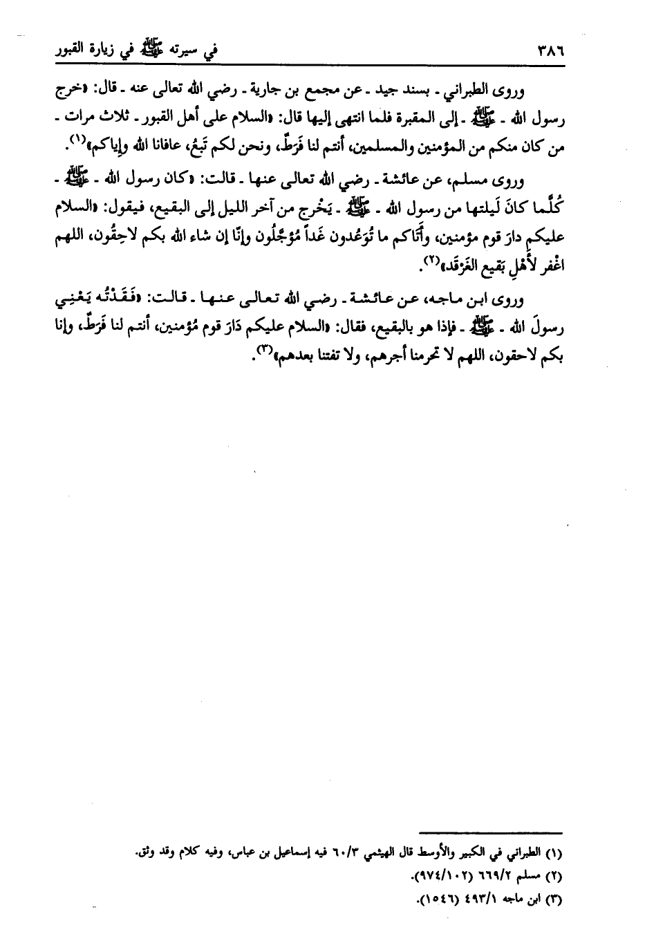 وروى ابن ماجه، عن عائشة- رضي الله تعالى عنها- قالت: «فقدته يعني رسول الله- صلى الله عليه وسلم- فإذا هو بالبقيع، فقال: «السلام عليكم دار قوم مؤمنين، أنتم لنا فرط، وإنا بكم لاحقون، اللهم لا تحرمنا أجرهم، ولا تفتنا بعدهم» [ (3) ] .