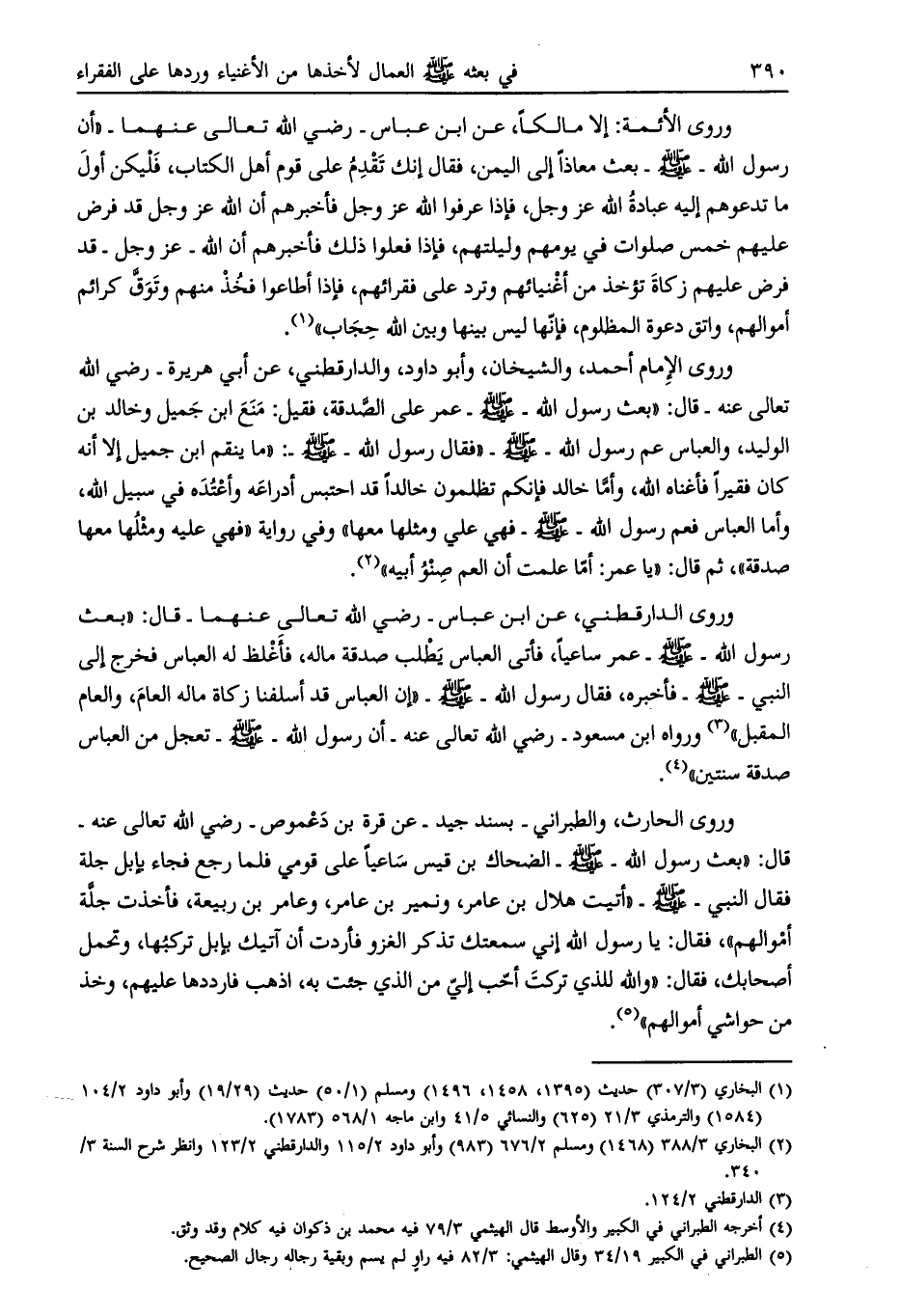 وروى الإمام أحمد، والشيخان، وأبو داود، والدارقطني، عن أبي هريرة- رضي الله تعالى عنه- قال: «بعث رسول الله- صلى الله عليه وسلم- عمر على الصّدقة، فقيل: منع ابن جميل وخالد بن الوليد، والعباس عم رسول الله- صلى الله عليه وسلم- «فقال رسول الله- صلى الله عليه وسلم-: «ما ينقم ابن جميل إلا أنه كان فقيرا فأغناه الله، وأمّا خالد فإنكم تظلمون خالدا قد احتبس أدراعه وأعتده في سبيل الله، وأما العباس فعم رسول الله- صلى الله عليه وسلم- فهي علي ومثلها معها» وفي رواية «فهي عليه ومثلها معها صدقة» ، ثم قال: «يا عمر: أما علمت أن العم صنو أبيه» [ (2) ] .