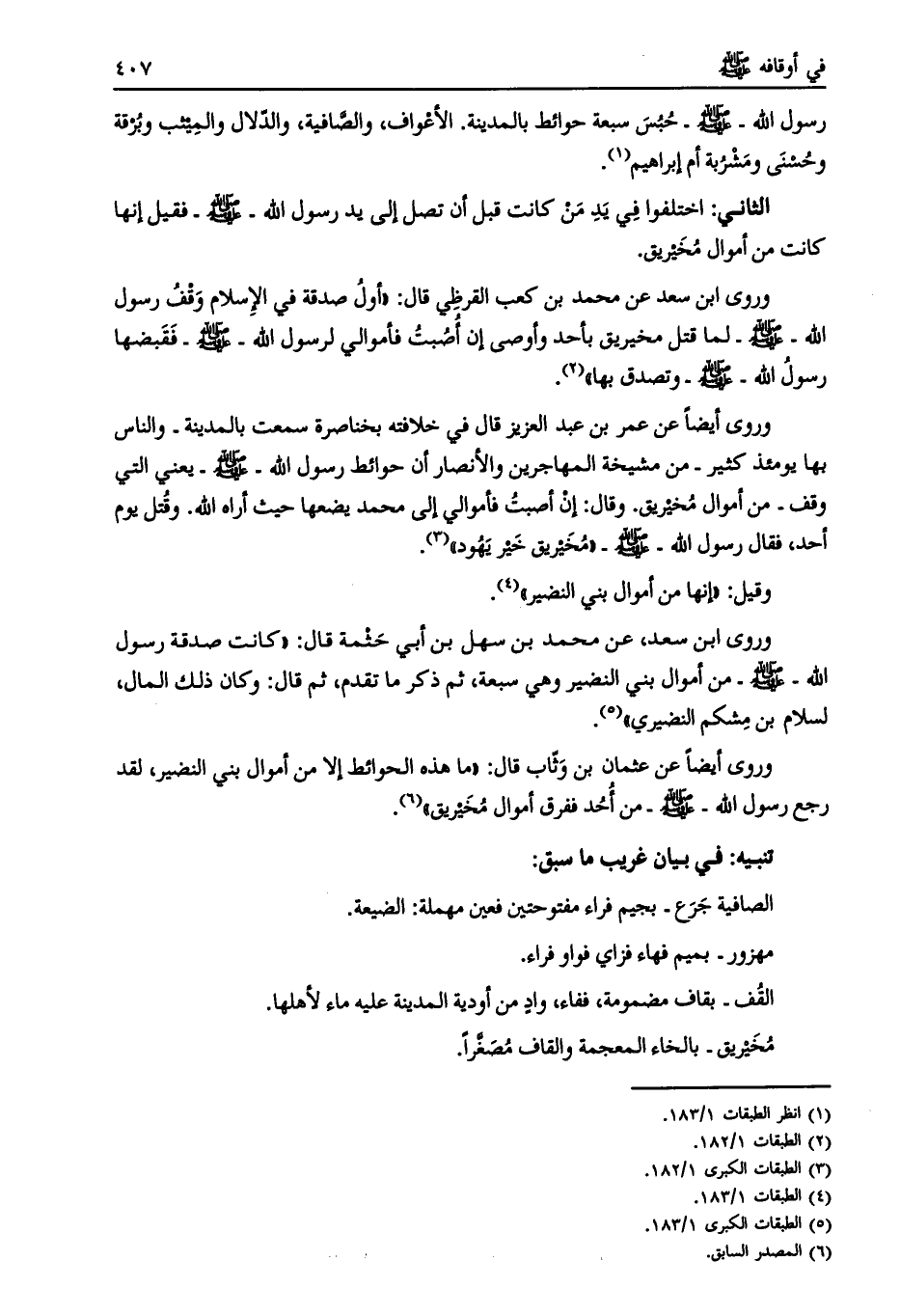 رسول الله- صلى الله عليه وسلم- حبس سبعة حوائط بالمدينة. الأعواف، والصّافية، والدّلال والميثب وبرقة وحسنى ومشربة أم إبراهيم [ (1) ] .