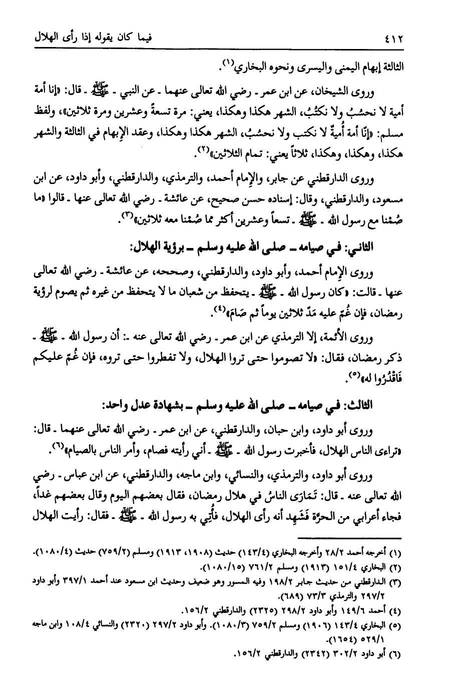 وروى أبو داود، والترمذي، والنسائي، وابن ماجة، والدارقطني، عن ابن عباس- رضي الله تعالى عنه- قال: تمارى الناس في هلال رمضان، فقال بعضهم اليوم وقال بعضهم غدا، فجاء أعرابي من الحرّة فشهد أنه رأى الهلال، فأتي به رسول الله- صلى الله عليه وسلم- فقال: رأيت الهلال