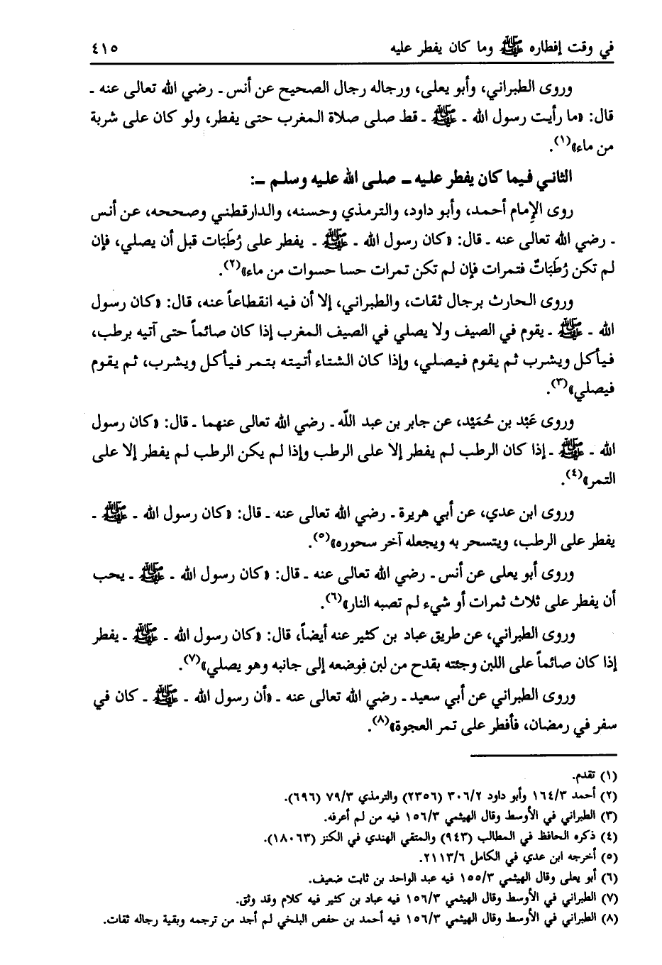 وروى الحارث برجال ثقات، والطبراني، إلا أن فيه انقطاعا عنه، قال: «كان رسول الله- صلى الله عليه وسلم- يقوم في الصيف ولا يصلي في الصيف المغرب إذا كان صائما حتى آتيه برطب، فيأكل ويشرب ثم يقوم فيصلي، وإذا كان الشتاء أتيته بتمر فيأكل ويشرب، ثم يقوم فيصلي» [ (3) ] .
