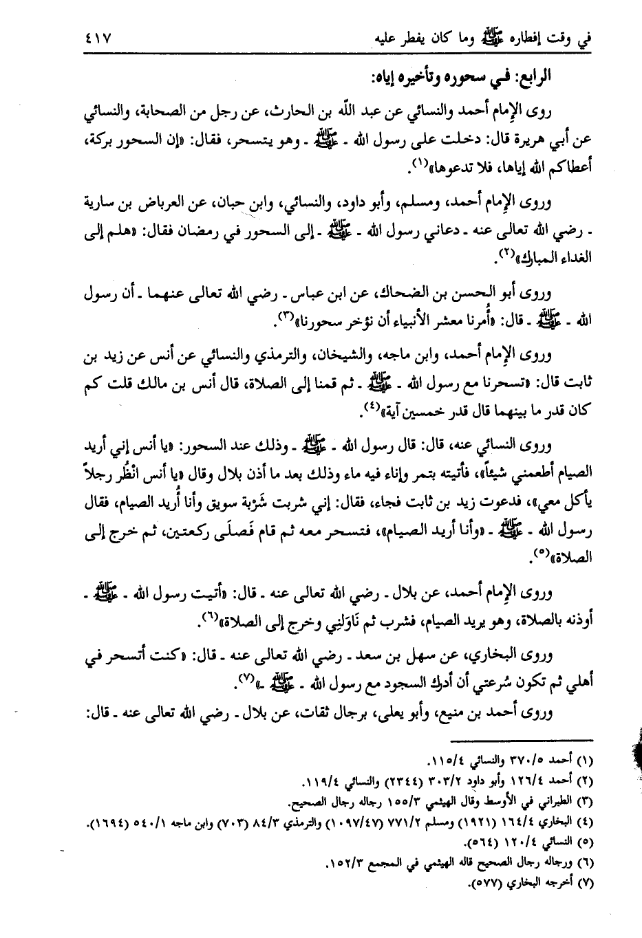 وروى الإمام أحمد، وابن ماجة، والشيخان، والترمذي والنسائي عن أنس عن زيد بن ثابت قال: «تسحرنا مع رسول الله- صلى الله عليه وسلّم- ثم قمنا إلى الصلاة، قال أنس بن مالك قلت كم كان قدر ما بينهما قال قدر خمسين آية» [ (4) ] .